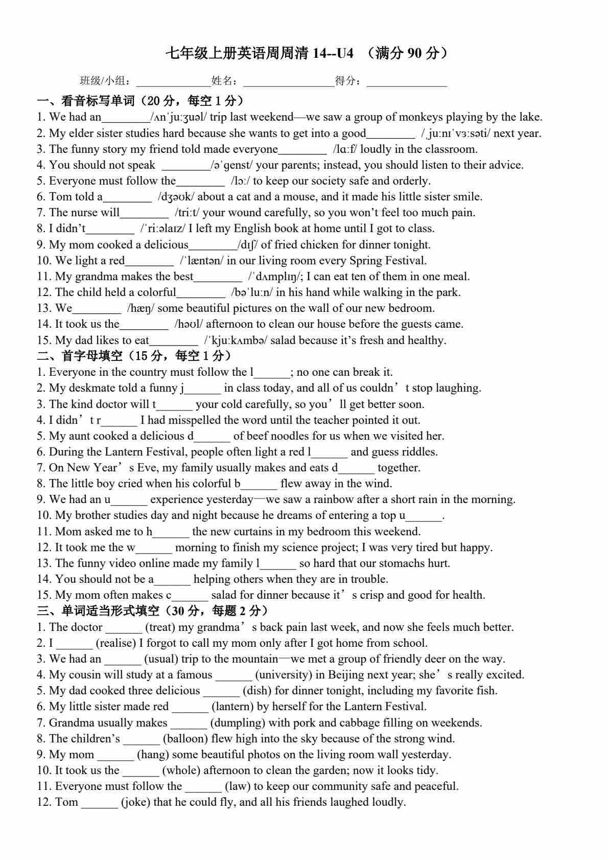 25秋外研七上英语练习题一一周周清14-Unit 4 Time to celebrate (含答案)