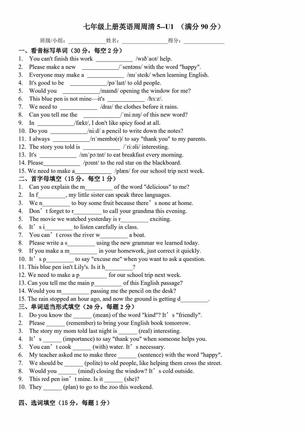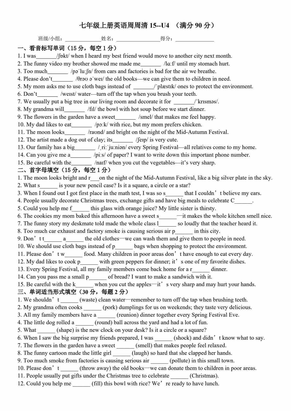 25秋外研七上英语练习题一一周周清15- Unit 4 Time to celebrate(含答案)