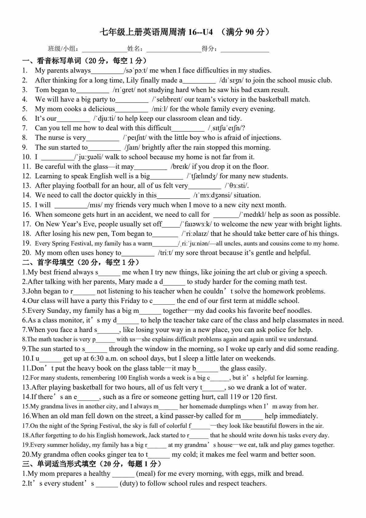 25秋外研七上英语练习题一一周周清16-Unit 4 Time to celebrate(含答案)