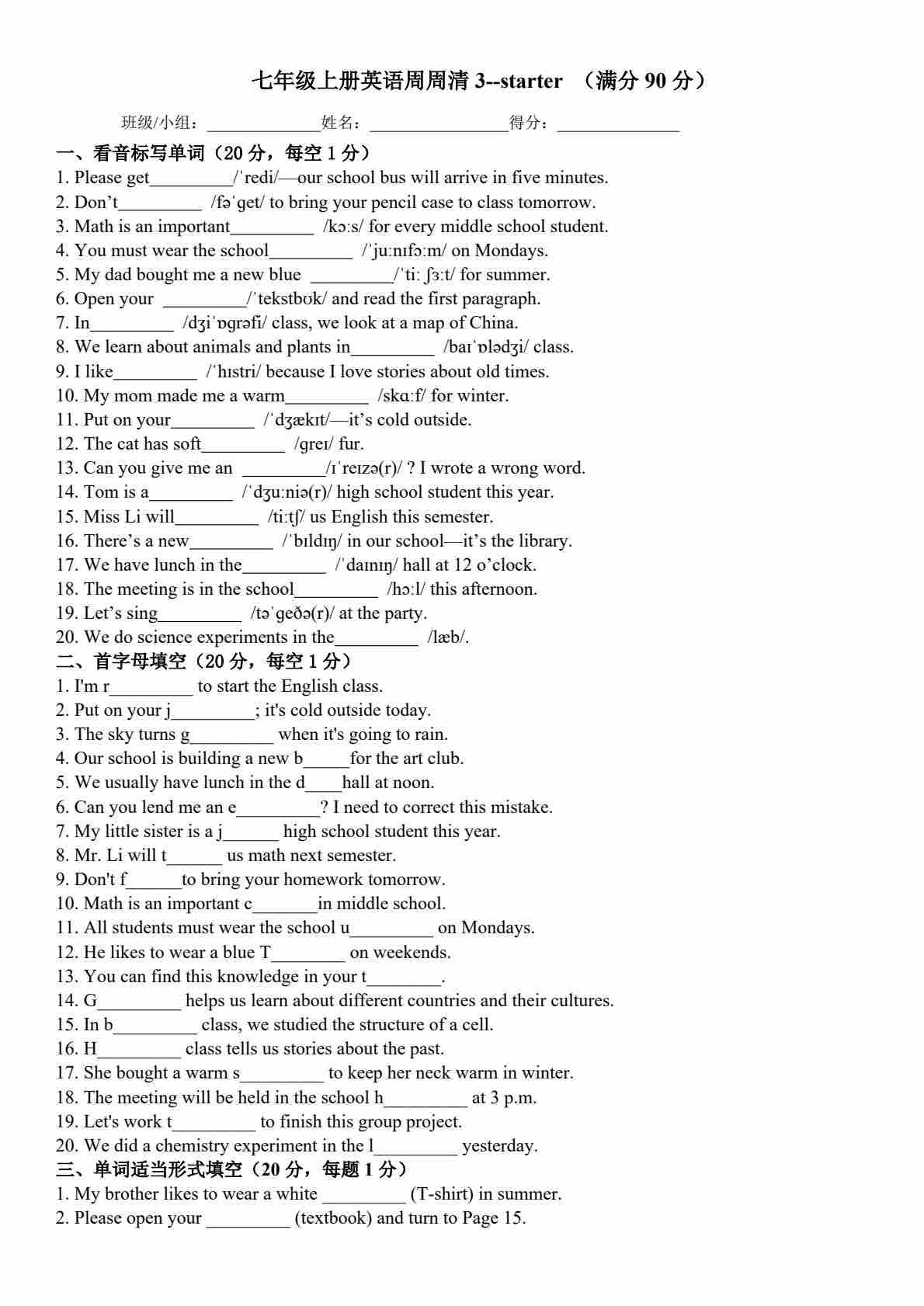 25秋外研七上英语练习题一一周周清3-Starter(含答案)