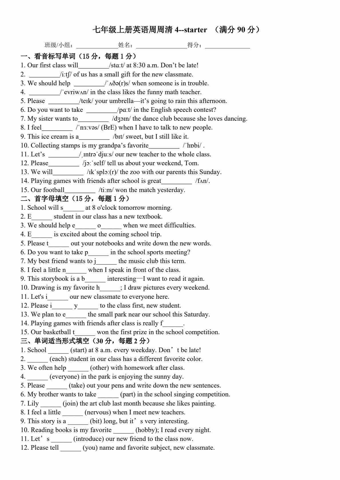 25秋外研七上英语练习题一一周周清4-Starter(含答案)