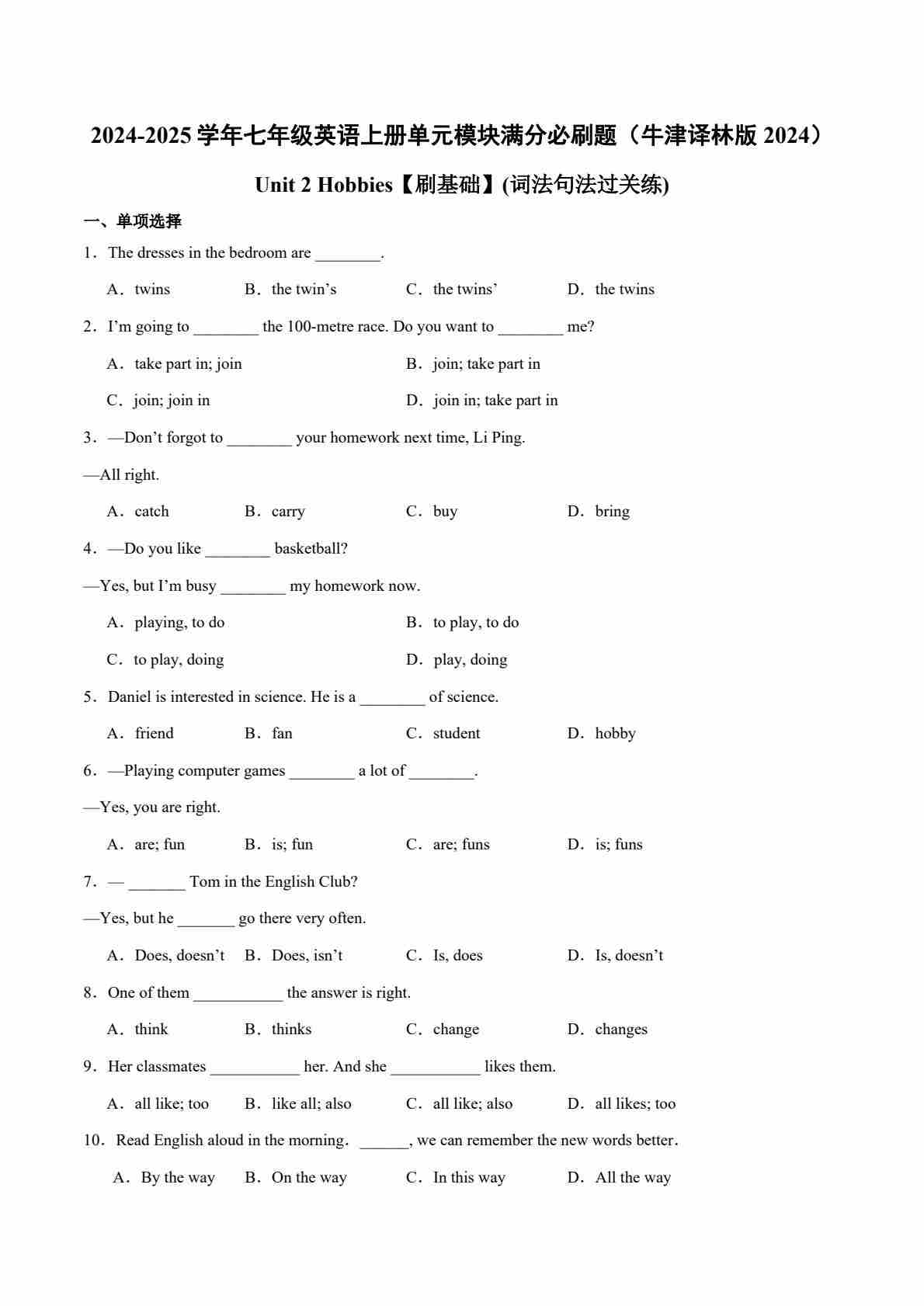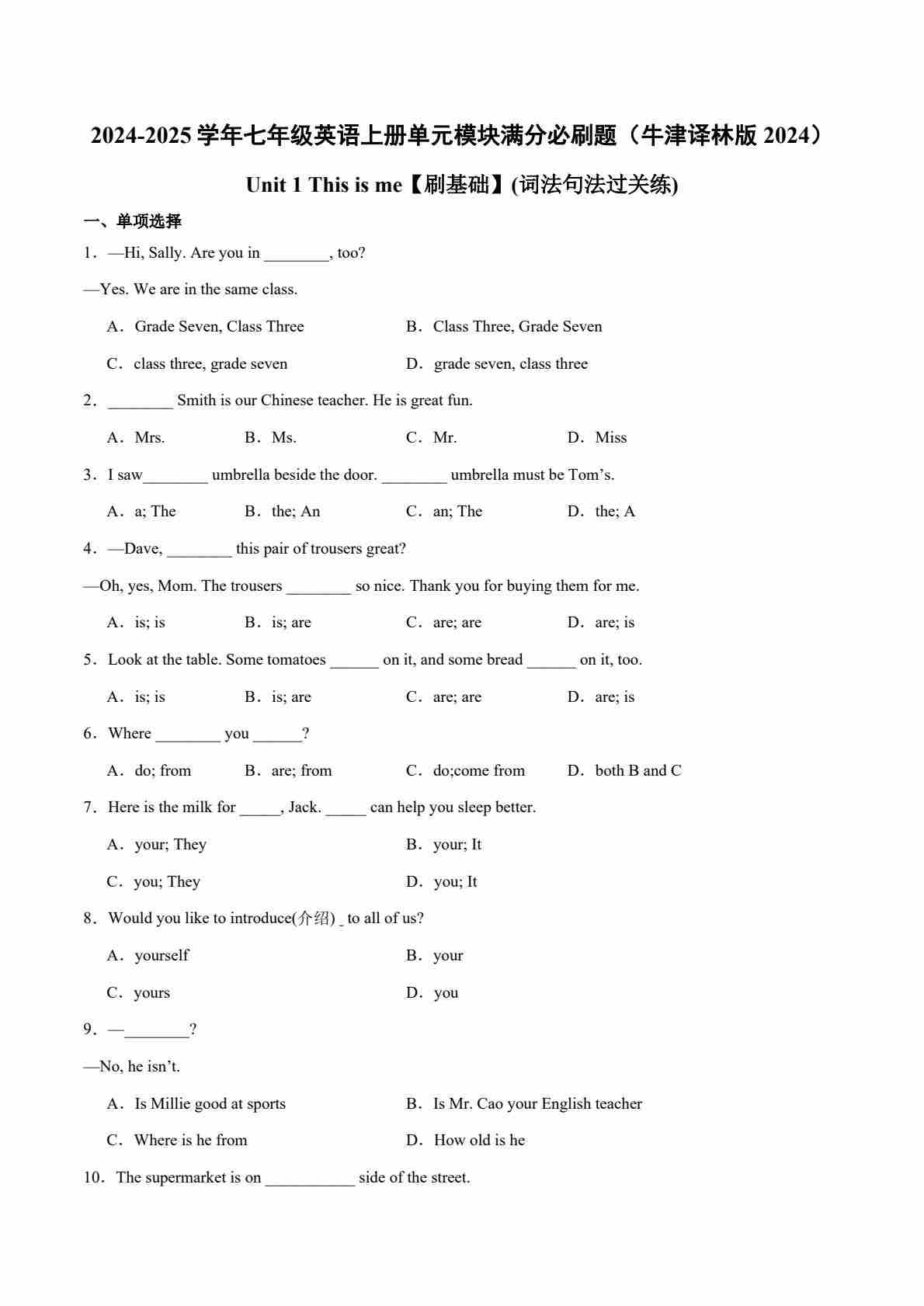 Unit 1【刷基础】(词法句法过关练)-2024-2025学年七年级英语上册单元模块满分必刷题(牛津译林版2024)