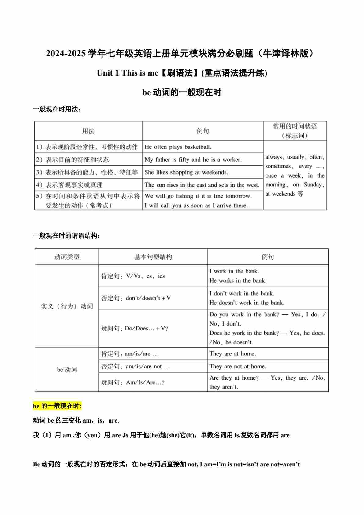 Unit 1【刷语法】be动词的一般现在时(重点语法提升练)-2024-2025学年七年级英语上册单元模块满分必刷题(牛津译林版2024)