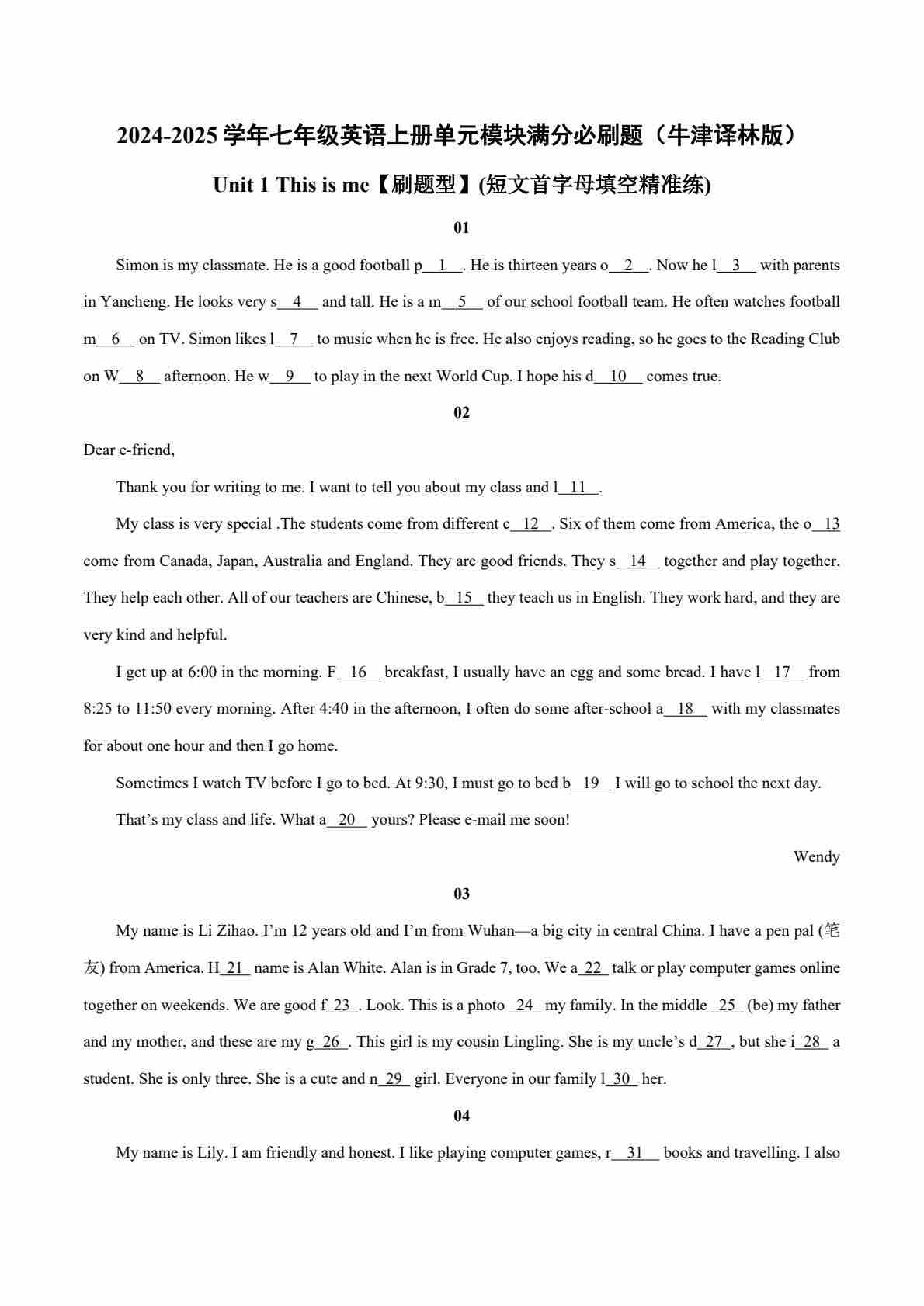 Unit 1【刷题型】(短文首字母填空精准练)-2024-2025学年七年级英语上册单元模块满分必刷题(牛津译林版2024)