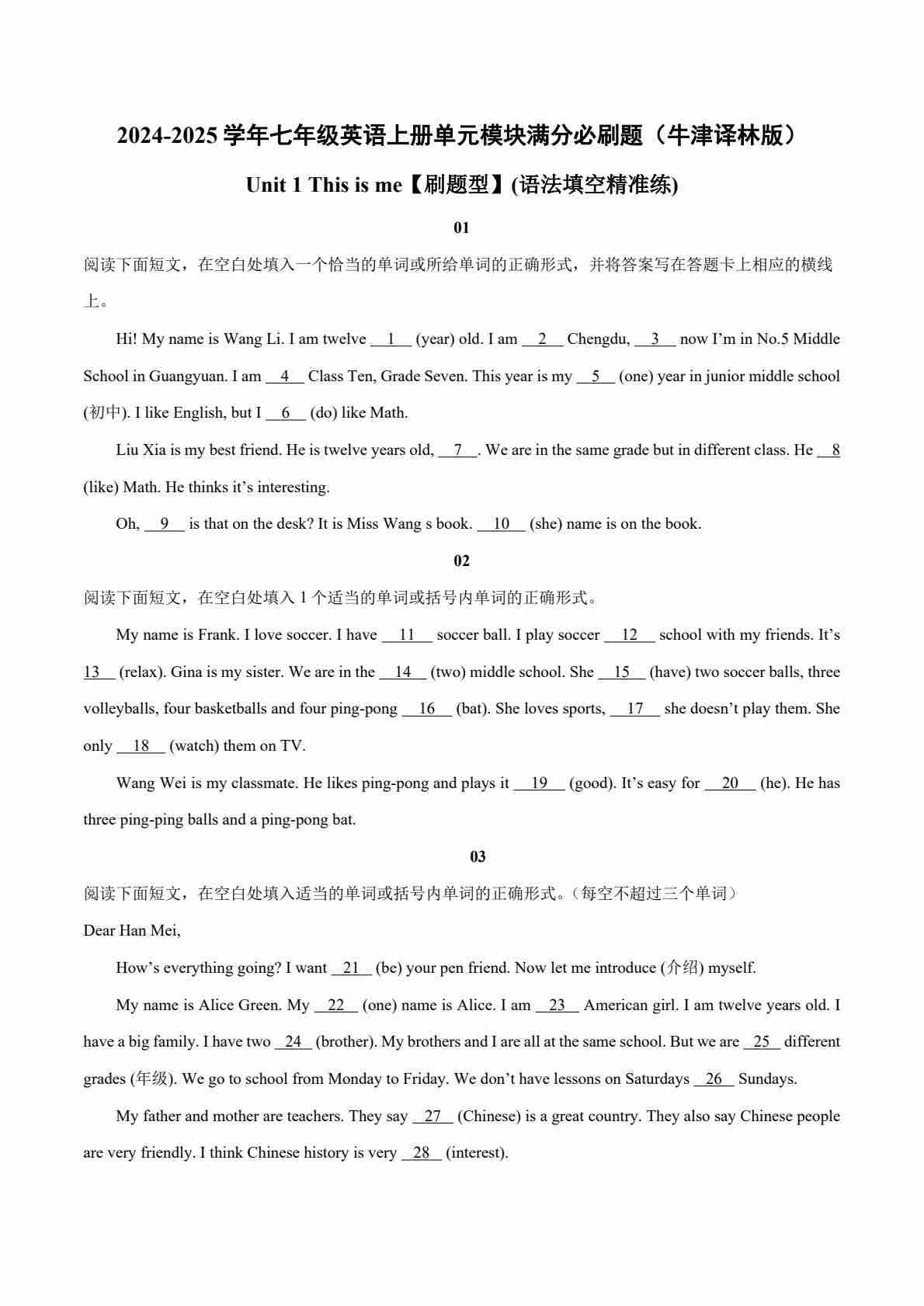 Unit 1【刷题型】(语法填空精准练)-2024-2025学年七年级英语上册单元模块满分必刷题(牛津译林版2024)