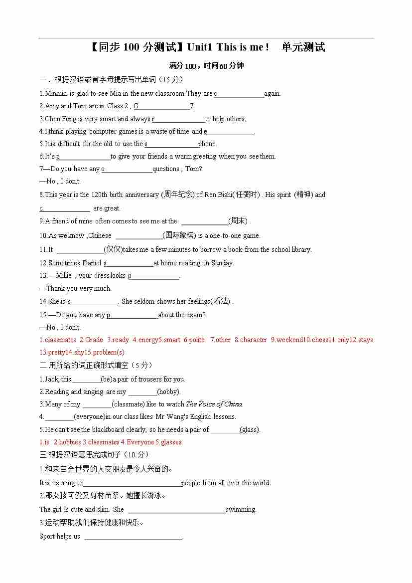 【同步100分测试】Unit1 This is me!单元测试(解析版)-2024-2025学年七年级上册同步单元测试(牛津译林版2024)