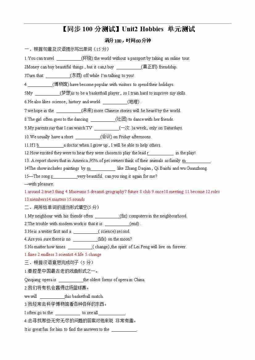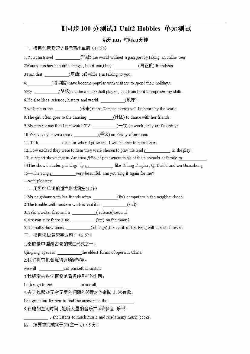 【同步100分测试】Unit2 Hobbies 单元测试(原卷版)-2024-2025学年七年级上册同步单元测试(牛津译林版2024)
