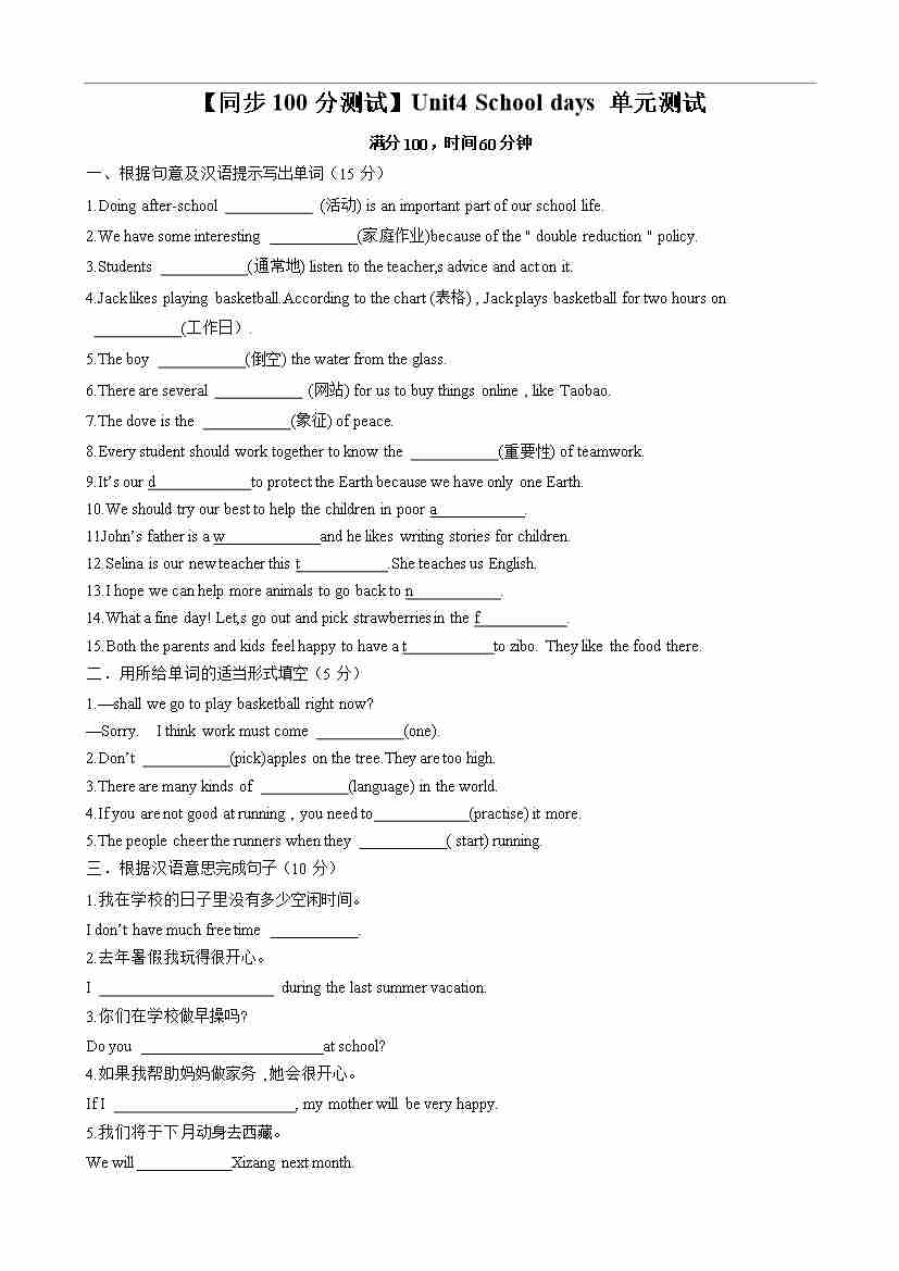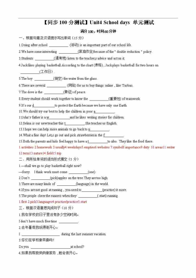 【同步100分测试】Unit4 School days 单元测试(原卷版)-2024-2025学年七年级上册同步单元测试(牛津译林版2024)
