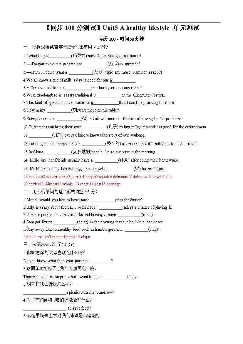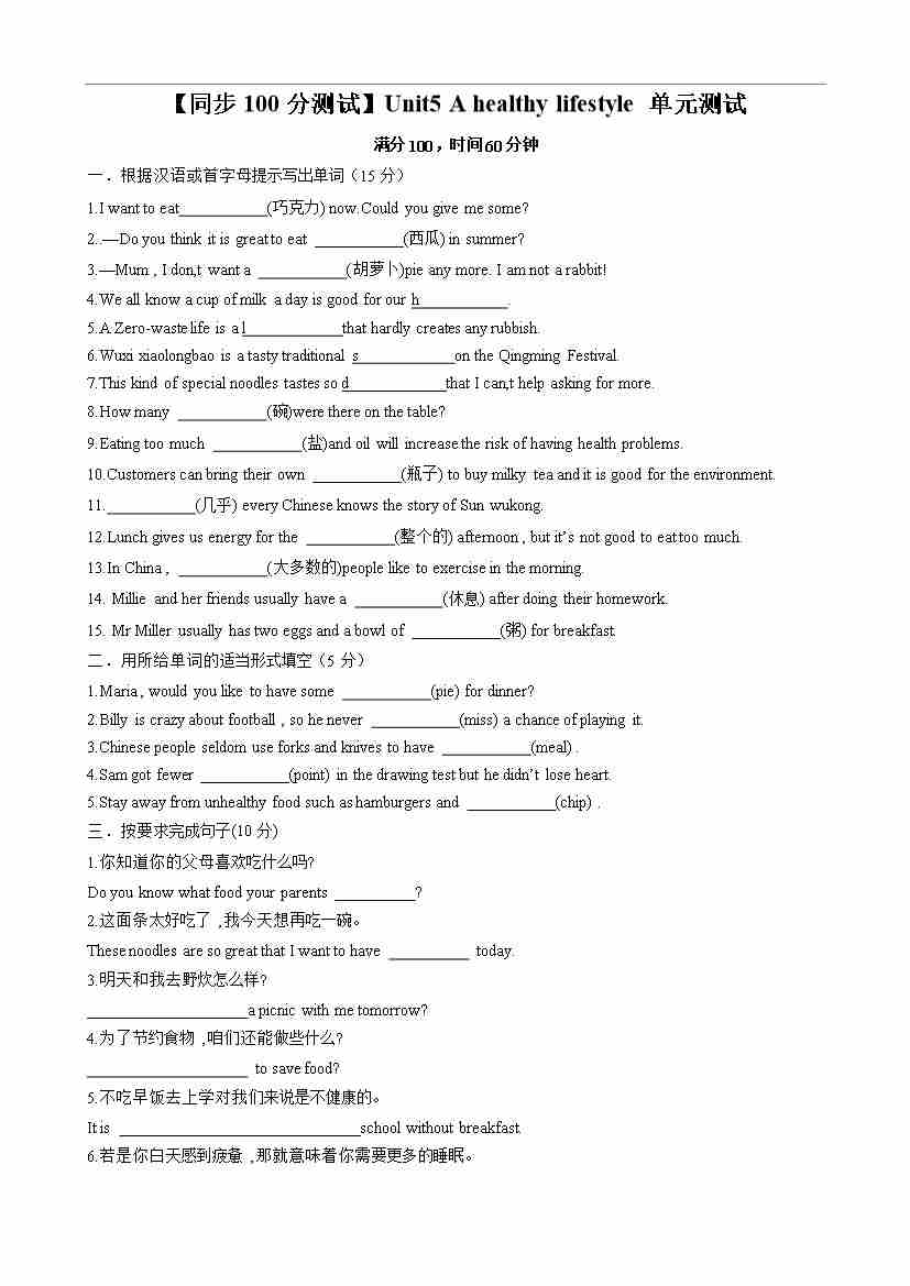 【同步100分测试】Unit5 A healthy lifestyle 单元测试(原卷版)-2024-2025学年七年级上册同步单元测试(牛津译林版2024)