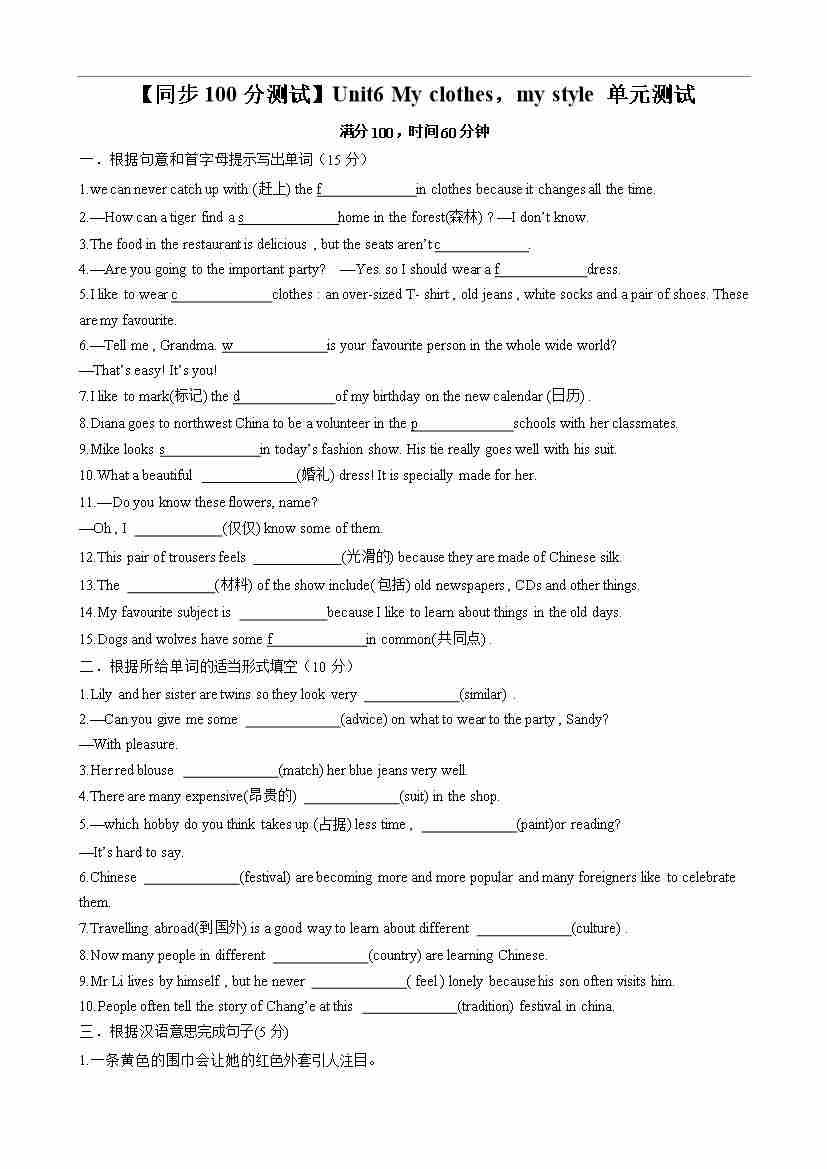 【同步100分测试】Unit6 My clothes,my style 单元测试(原卷版)-2024-2025学年七年级上册同步单元测试(牛津译林版2024)