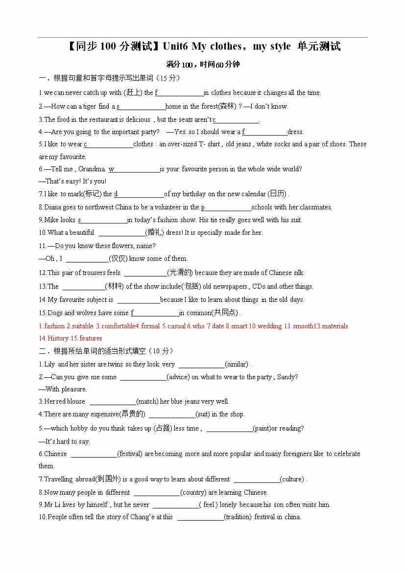 【同步100分测试】Unit6 My clothes,my style 单元测试(解析版)-2024-2025学年七年级上册同步单元测试(牛津译林版2024)