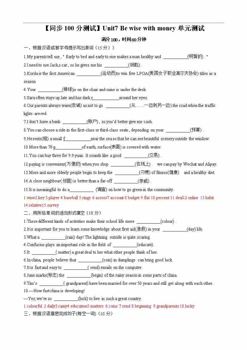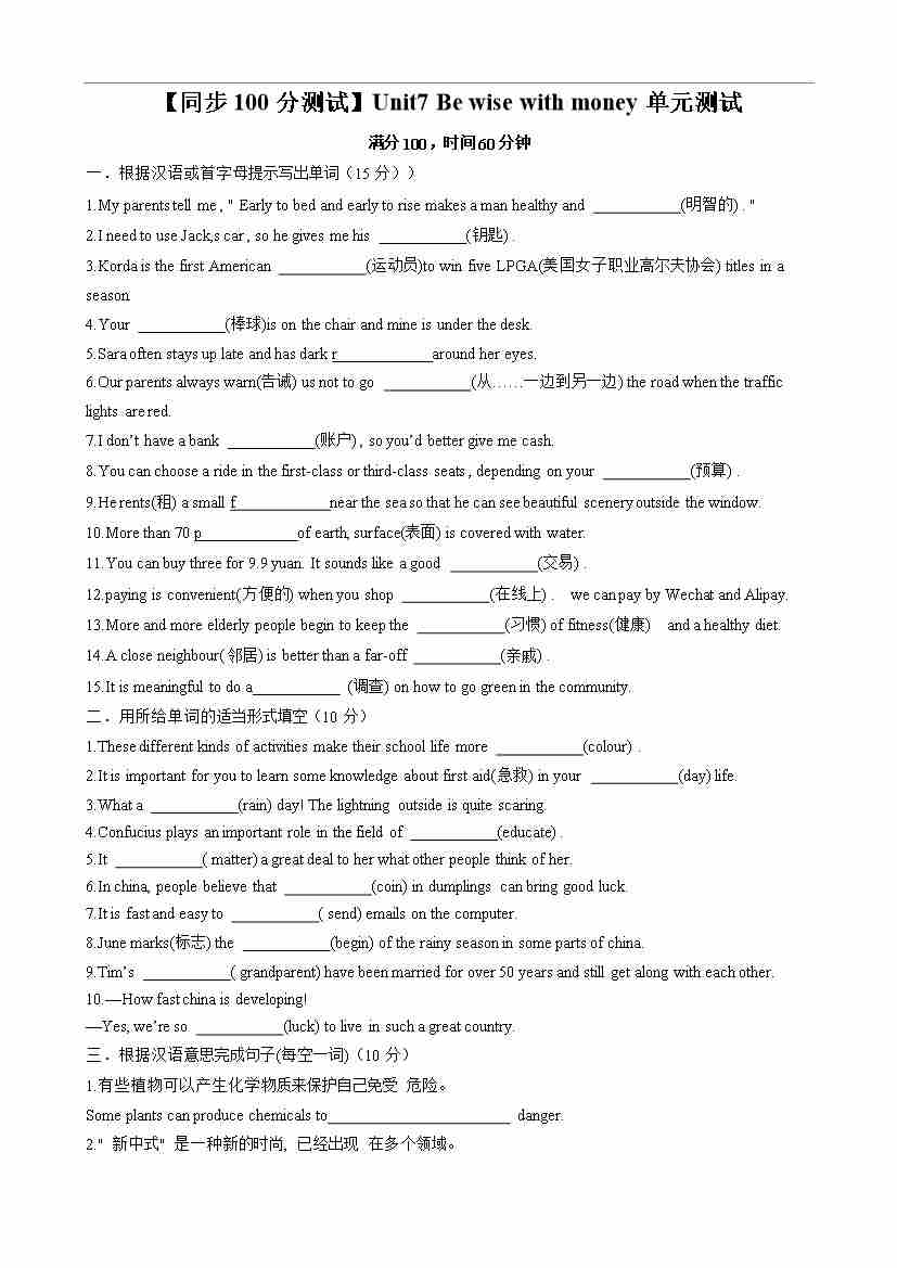 【同步100分测试】Unit7 Be wise with money单元测试(原卷版)-2024-2025学年七年级上册同步单元测试(牛津译林版2024)