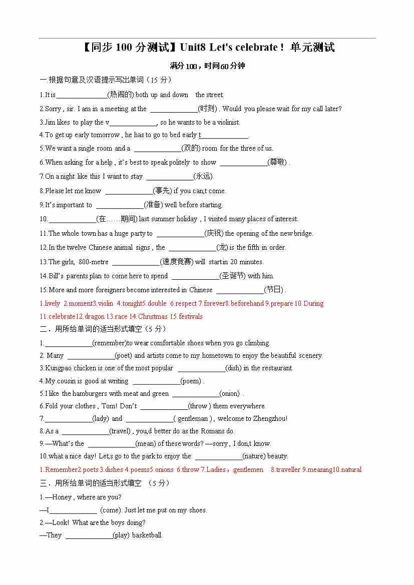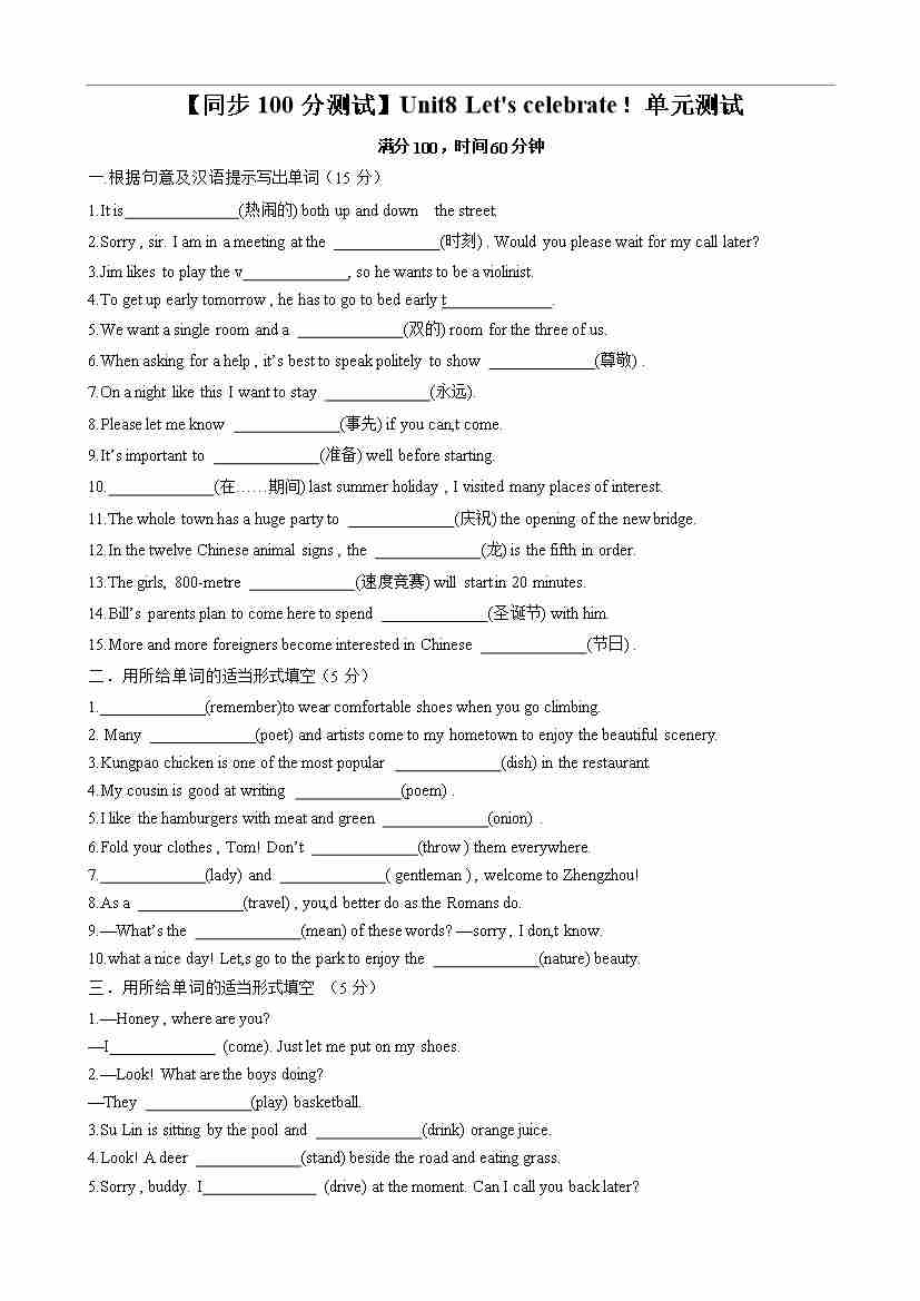 【同步100分测试】Unit8 Let's celebrate! 单元测试(原卷版)-2024-2025学年七年级上册同步单元测试(牛津译林版2024)