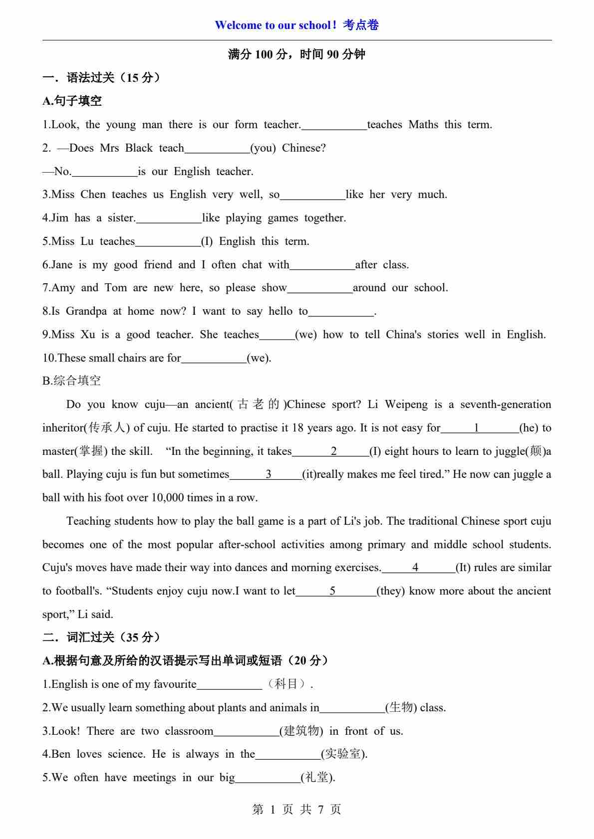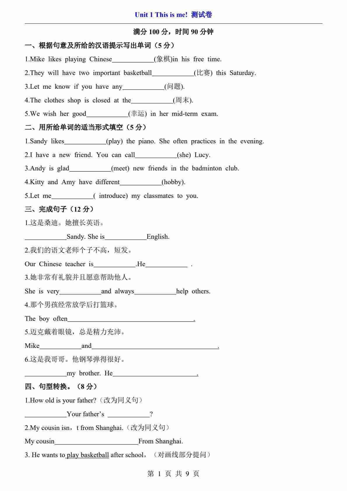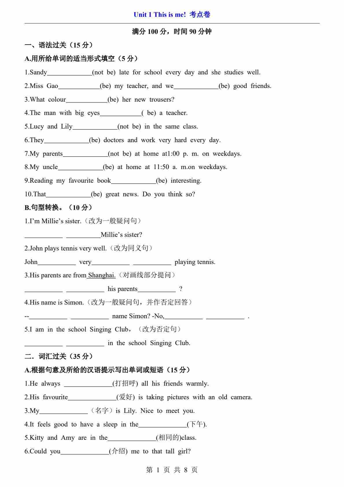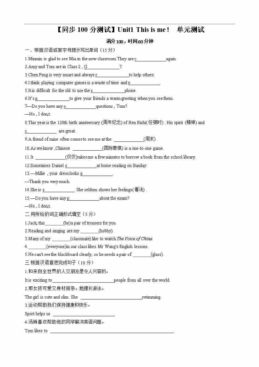 【同步100分测试】Unit1 This is me!单元测试(原卷版)-2024-2025学年七年级上册同步单元测试(牛津译林版2024)