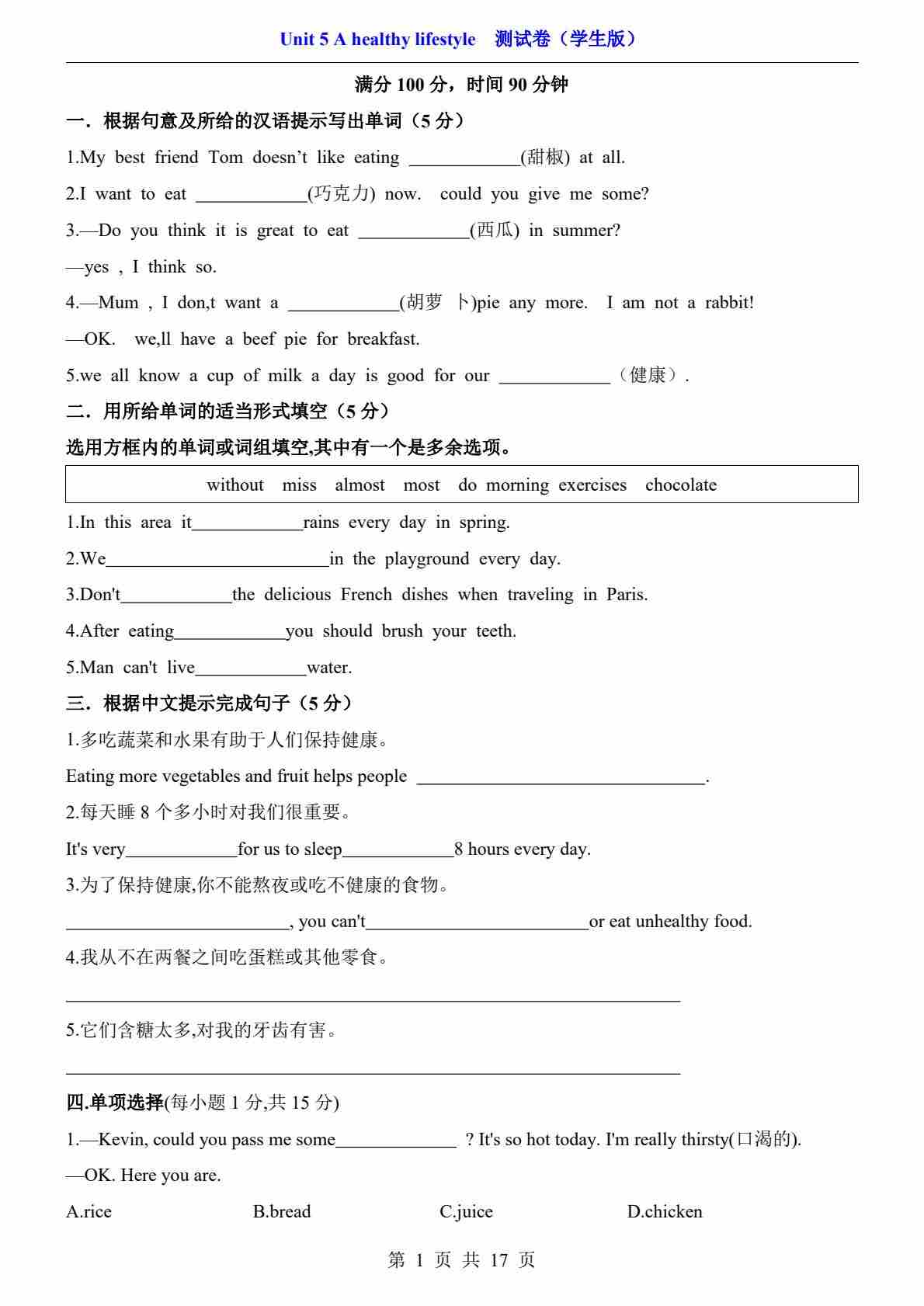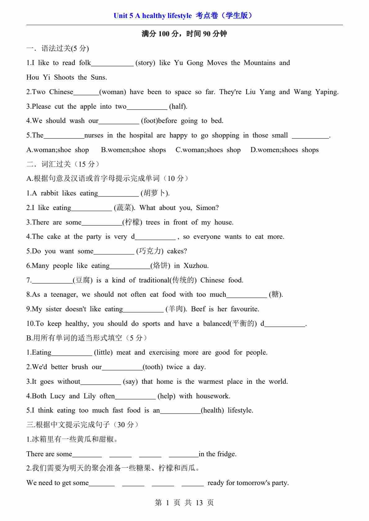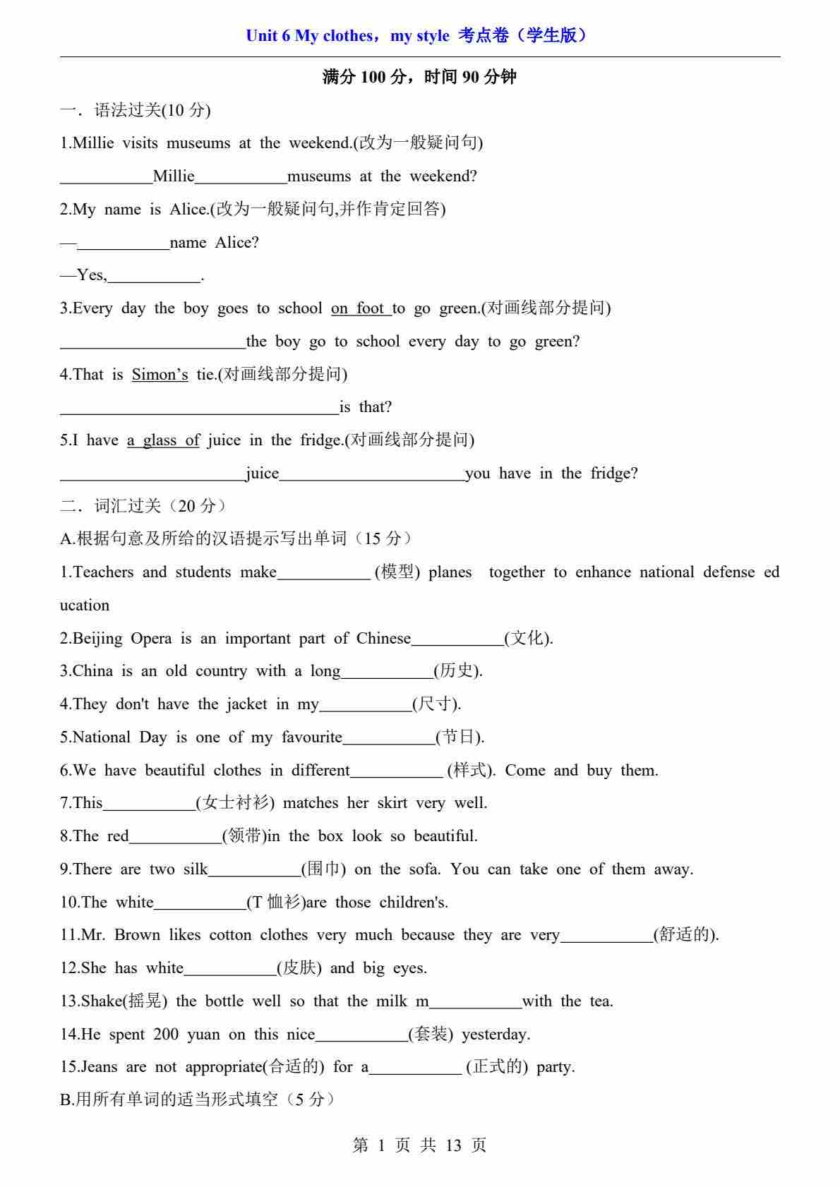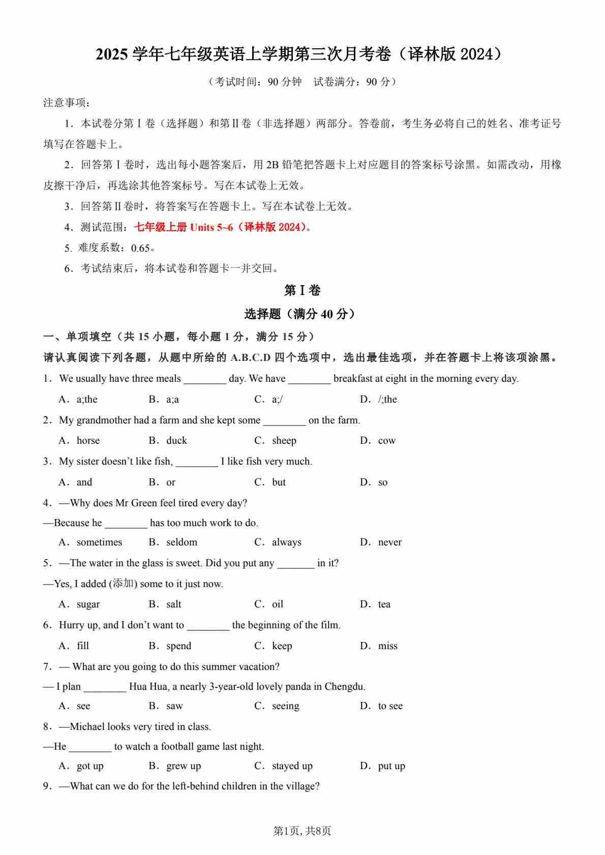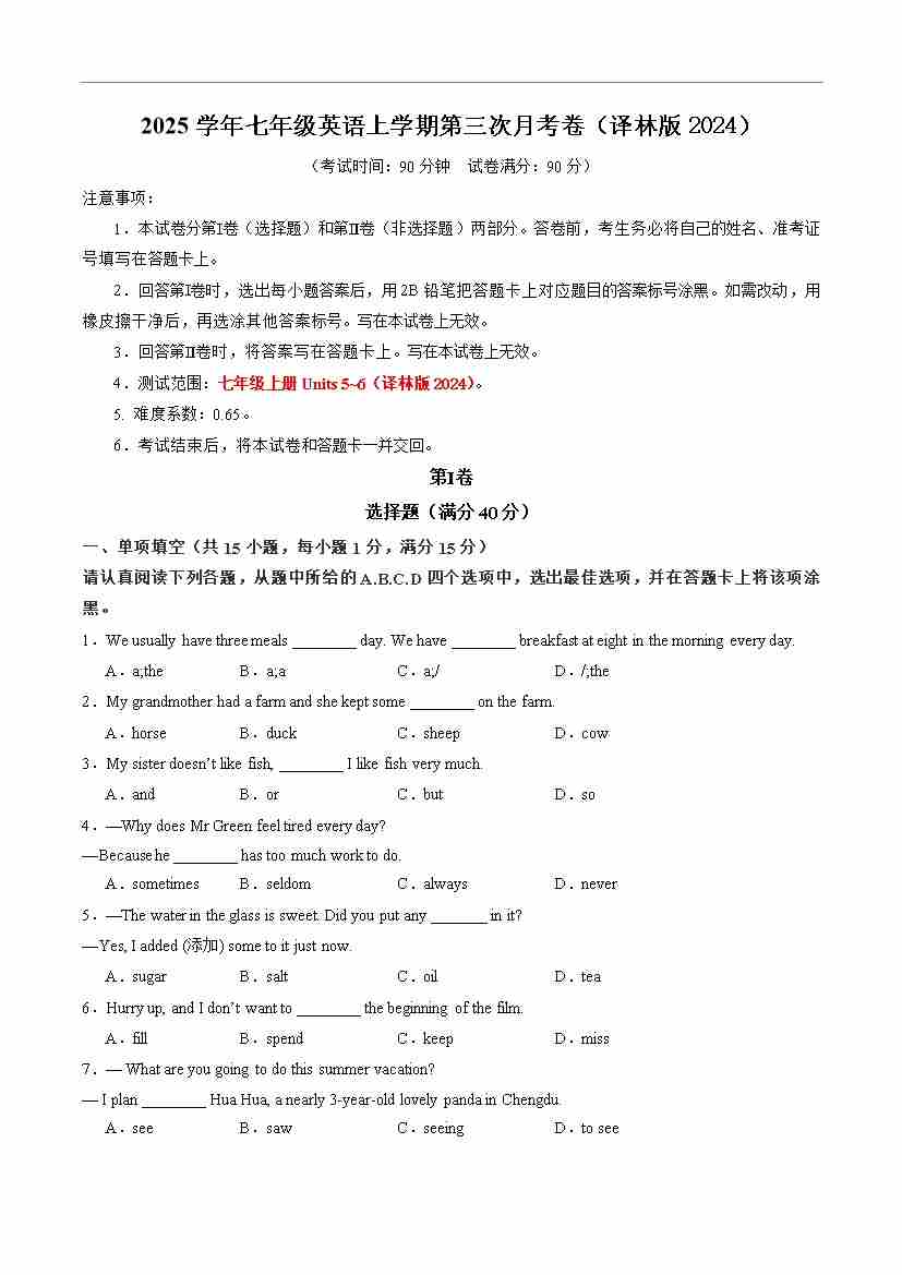 七年级译林英语第三次月考卷(考试版)【测试范围:七上Units 5~6】