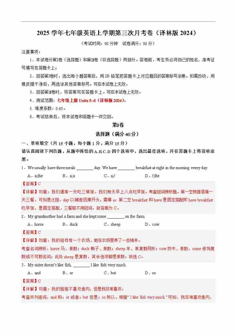 七年级英语第三次月考卷(全解全析)(译林版2024)