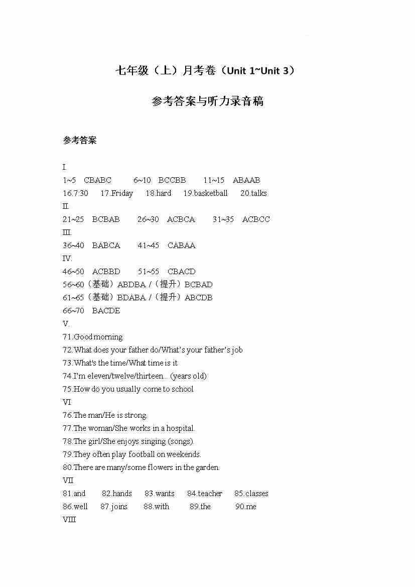 2024秋 福建七年级上册月考卷(Unit 1~Unit 3答案)