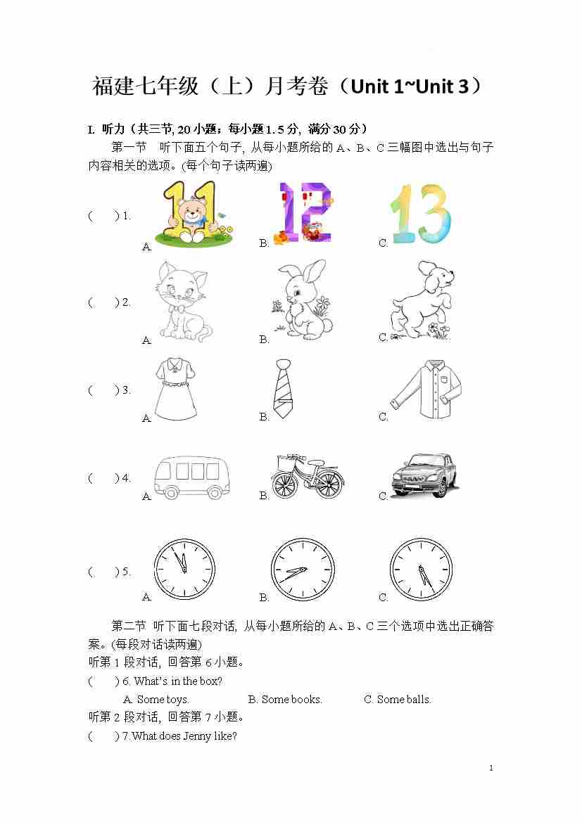 2024秋 福建七年级上册月考卷(Unit 1~Unit 3)