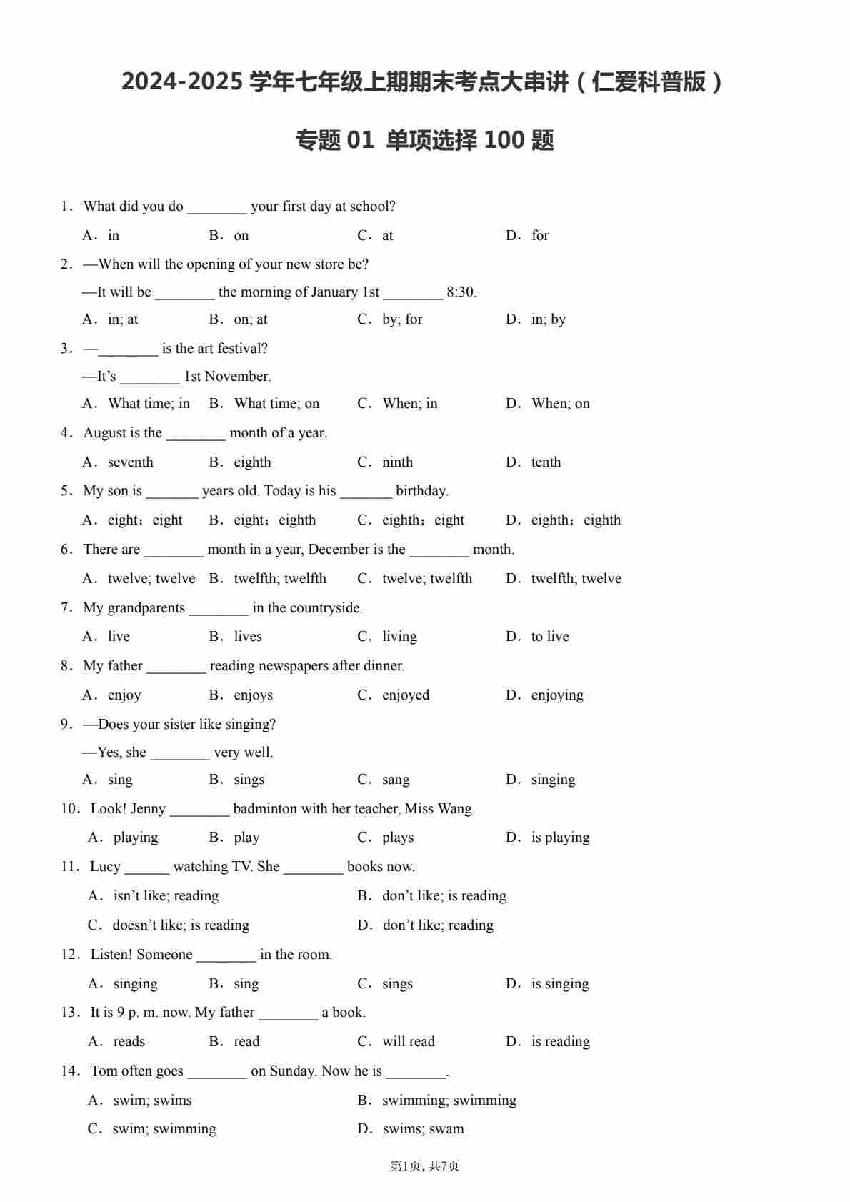 【七上仁爱英语】专题01 单项选择100题【考题猜想】(原卷版)