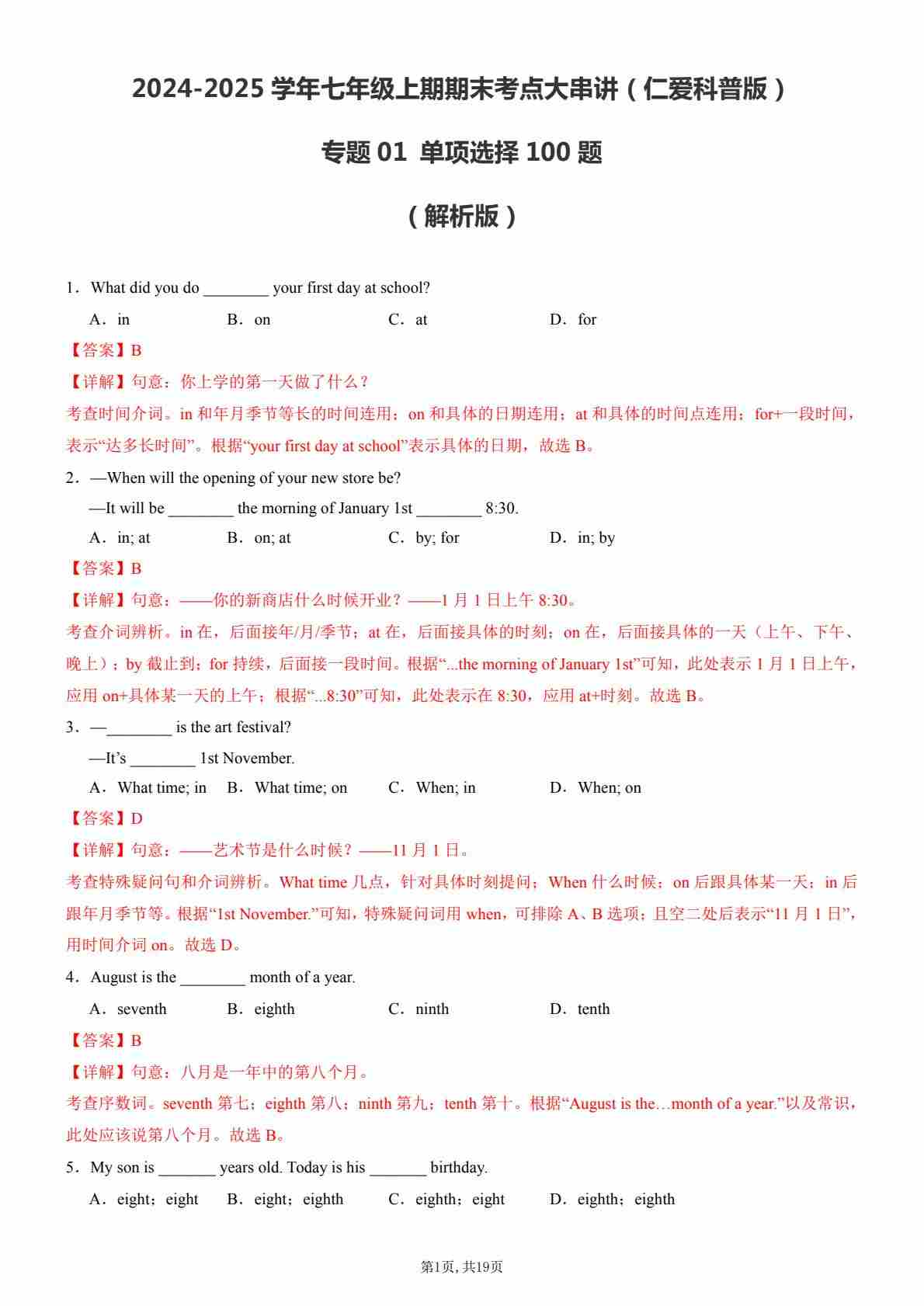 【七上仁爱英语】专题01 单项选择100题【考题猜想】(解析版)