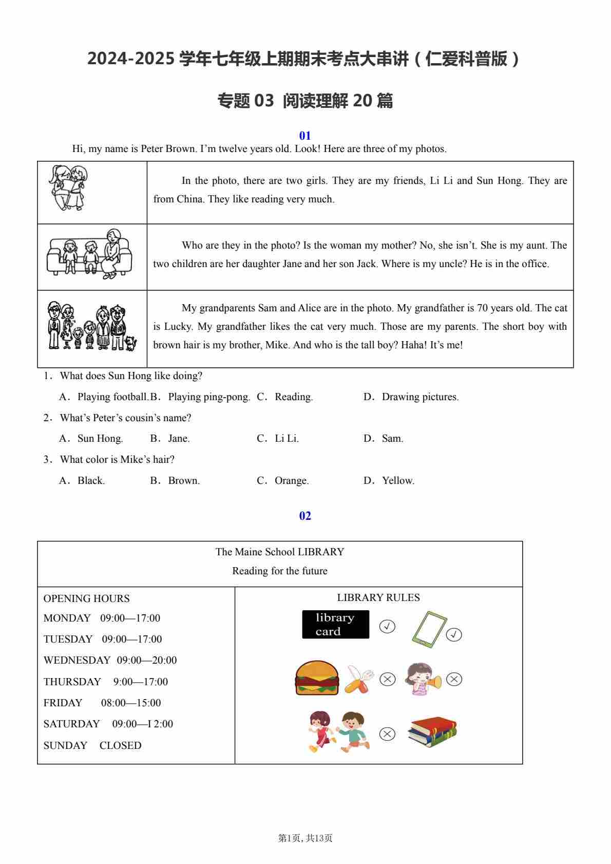 【七上仁爱英语】专题03 阅读理解20篇【考题猜想】(原卷版)