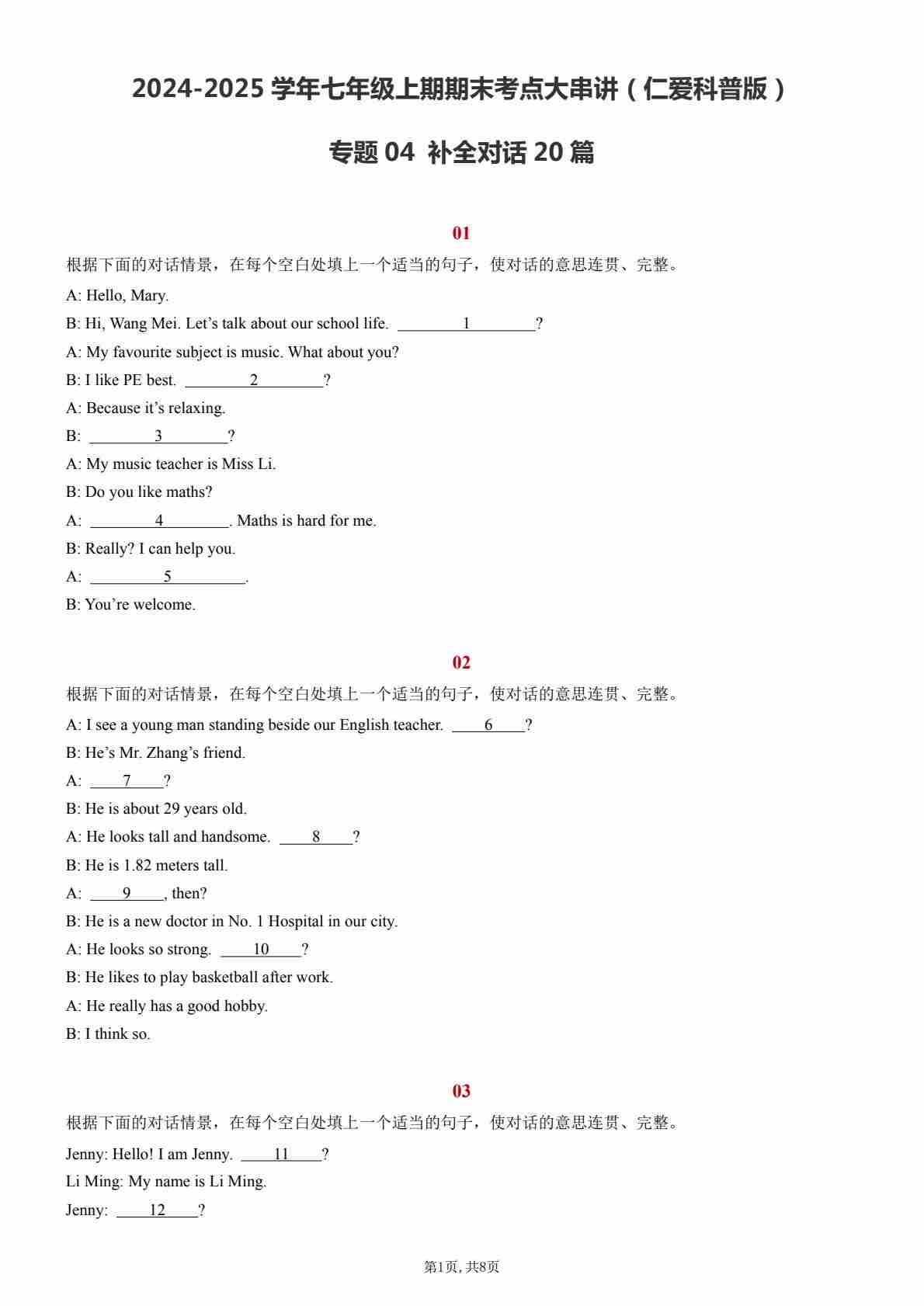 【七上仁爱英语】专题04 补全对话20篇【考题猜想】(原卷版)