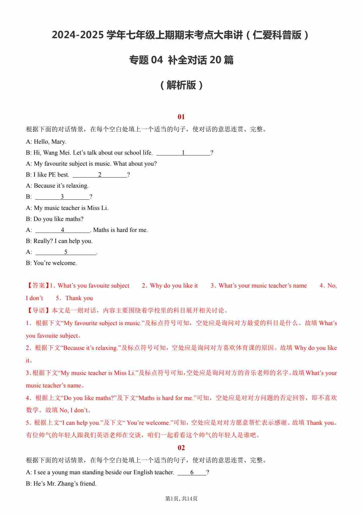 【七上仁爱英语】专题04 补全对话20篇【考题猜想】(解析版)