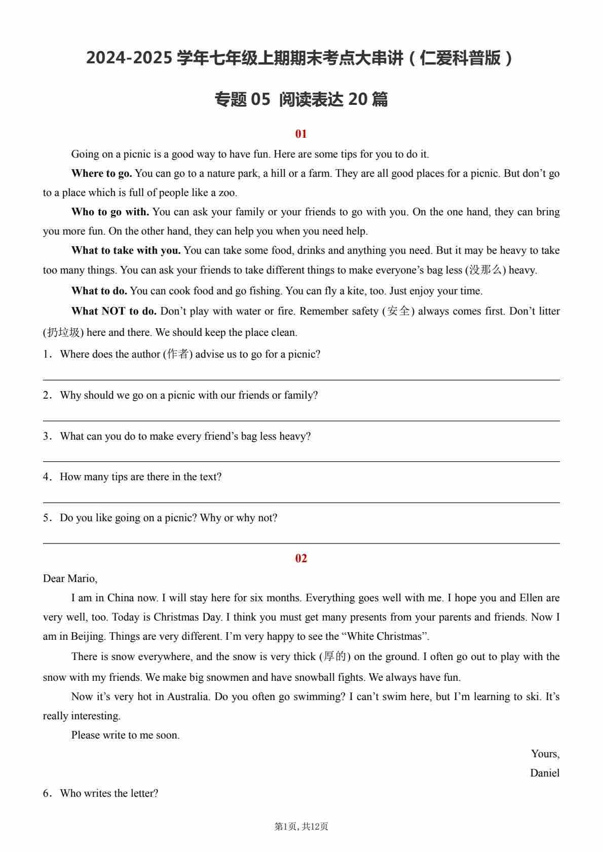 【七上仁爱英语】专题05 阅读表达20篇【考题猜想】(原卷版)