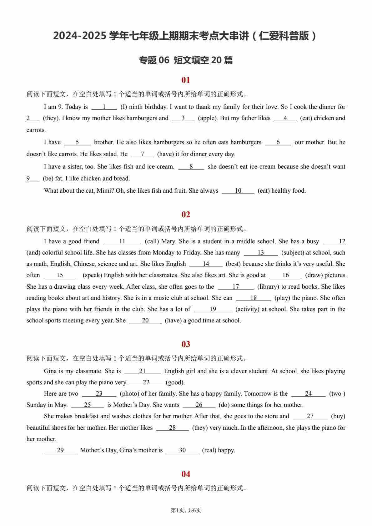【七上仁爱英语】专题06 短文填空20篇【考题猜想】(原卷版)