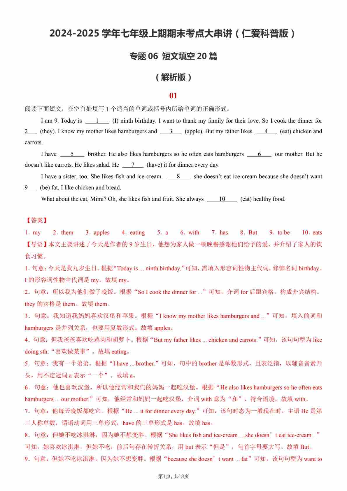 【七上仁爱英语】专题06 短文填空20篇【考题猜想】(解析版)