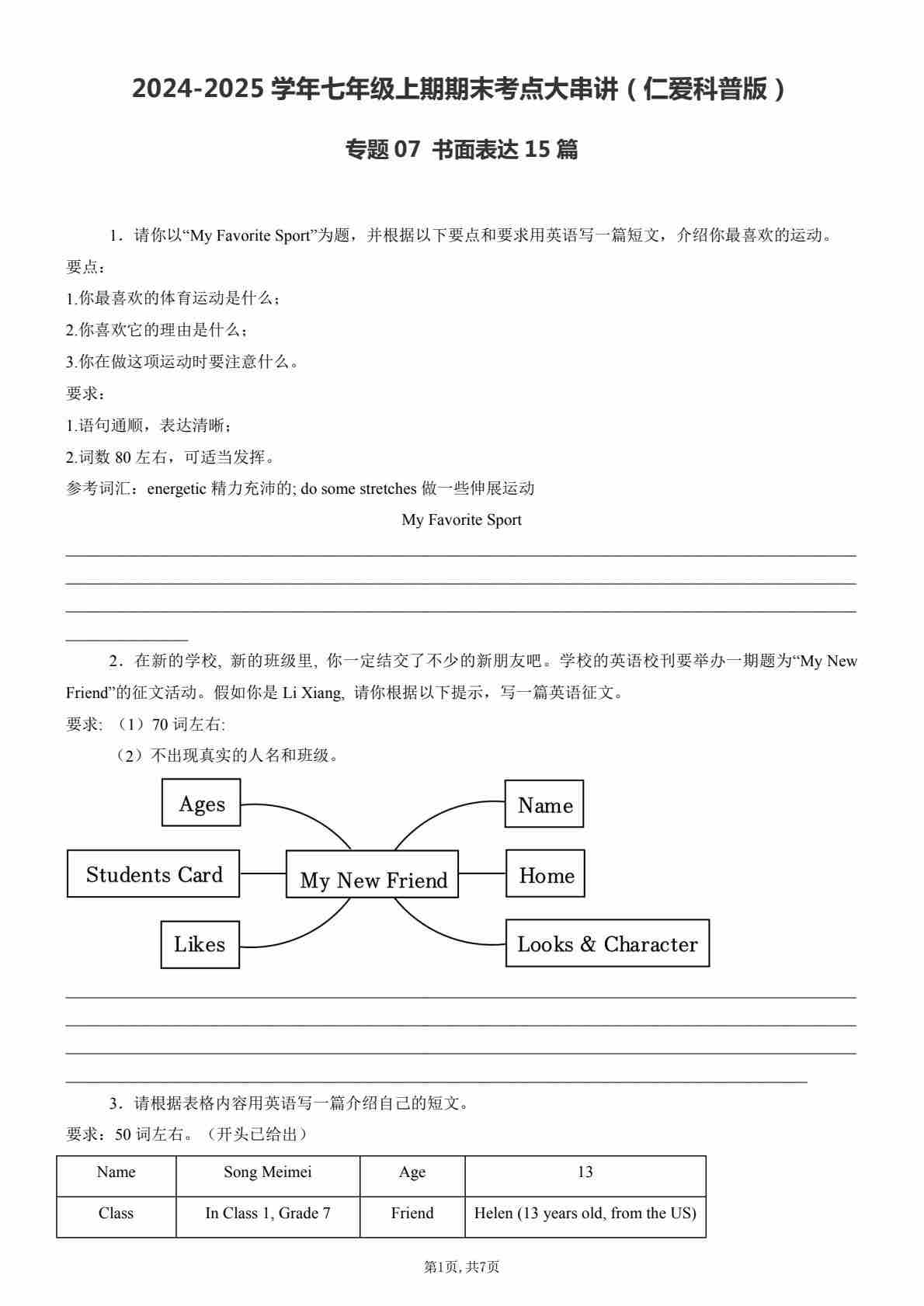 【七上仁爱英语】专题07 书面表达15篇【考题猜想】(原卷版)