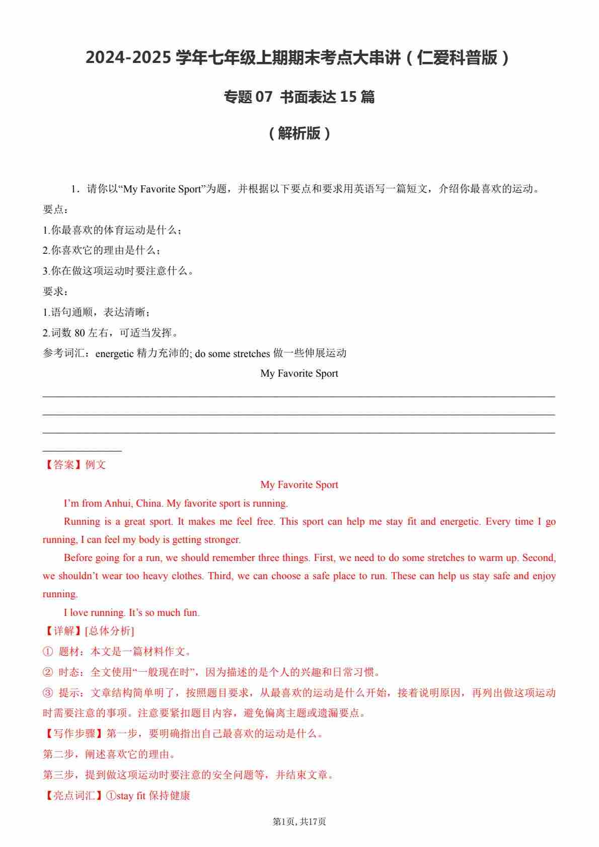 【七上仁爱英语】专题07 书面表达15篇【考题猜想】(解析版)
