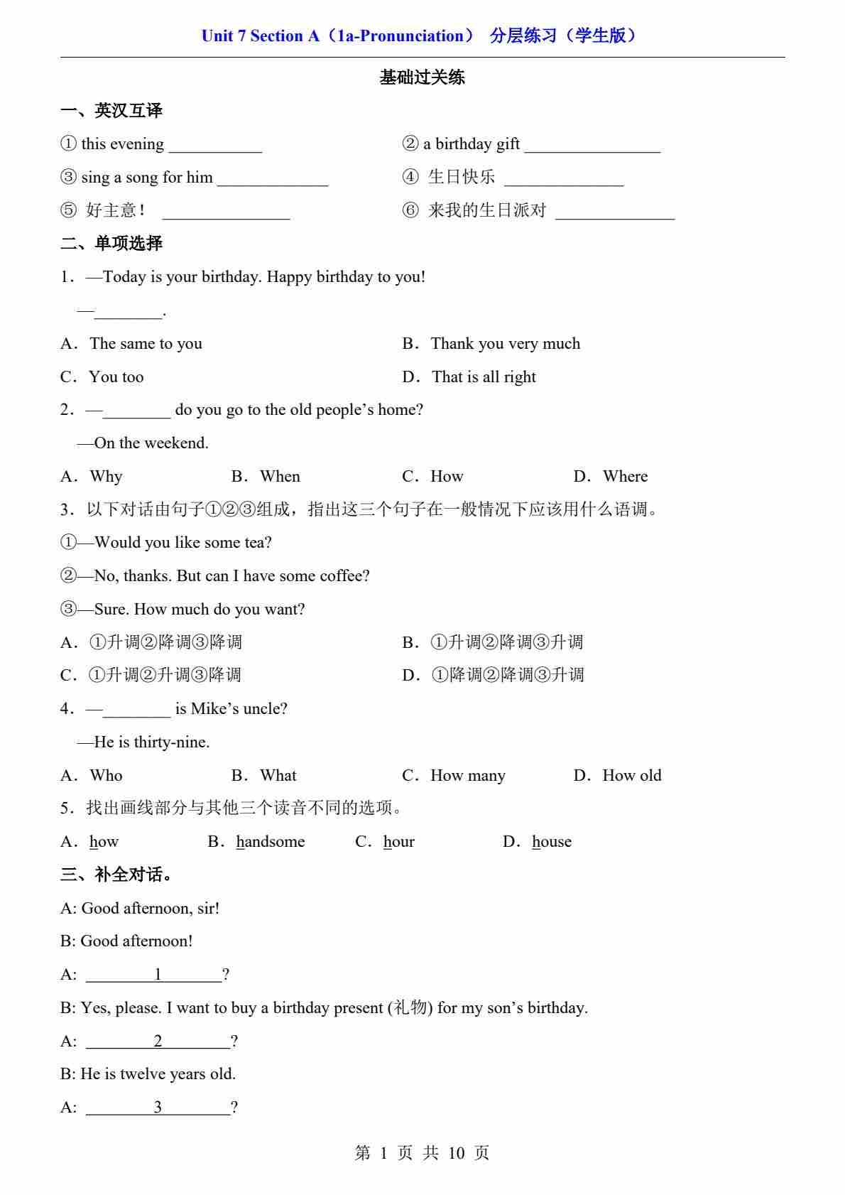 Unit 7 Section A(1a-Pronunciation)(分层练习)