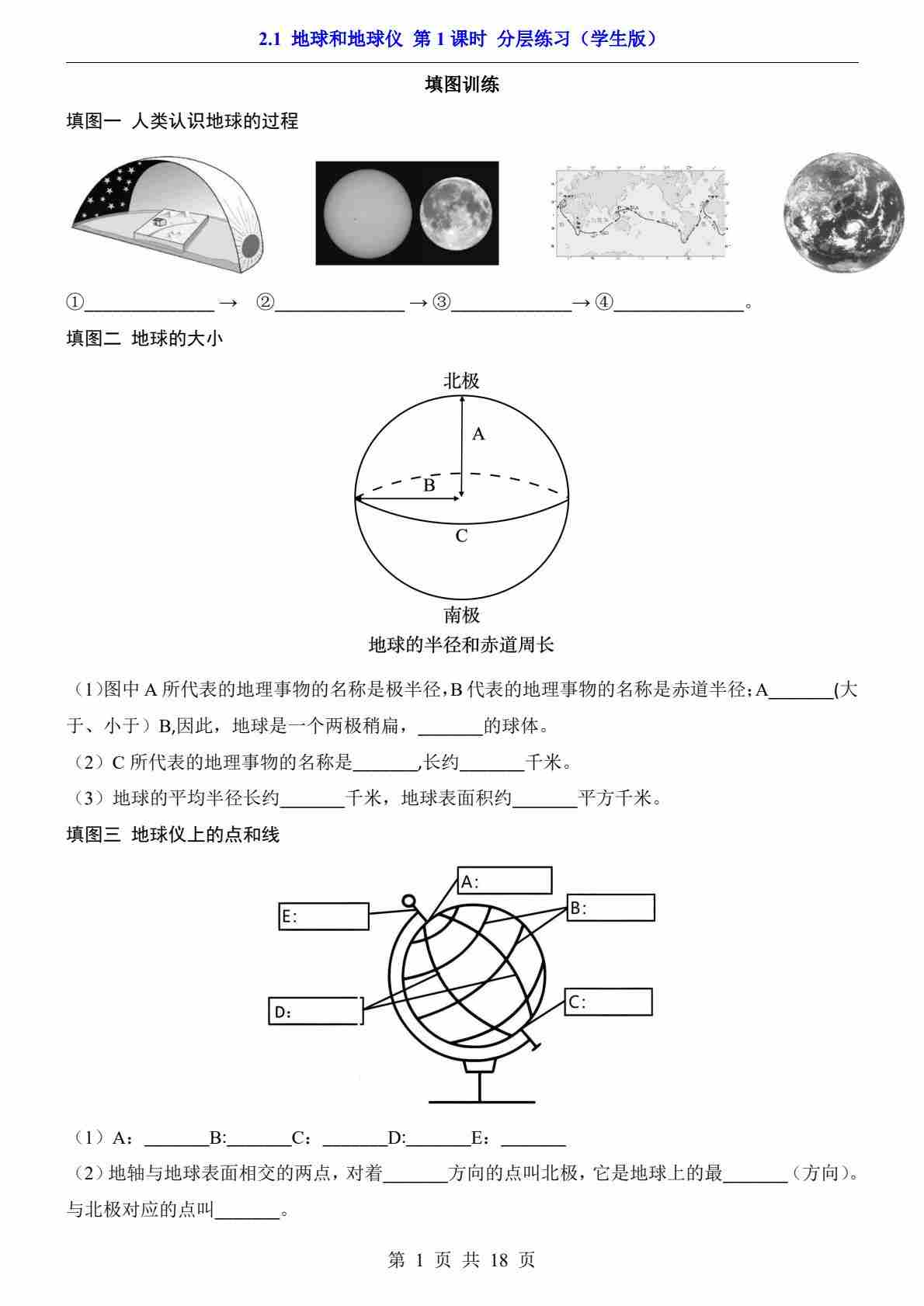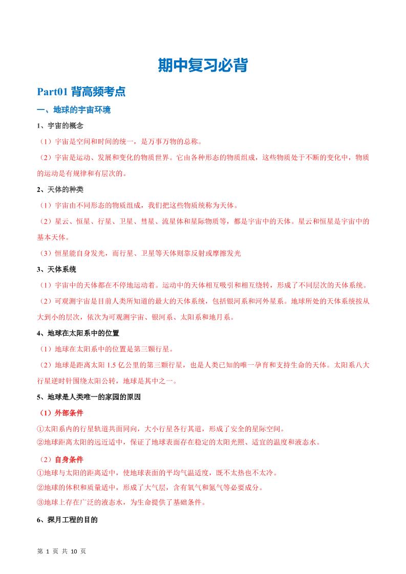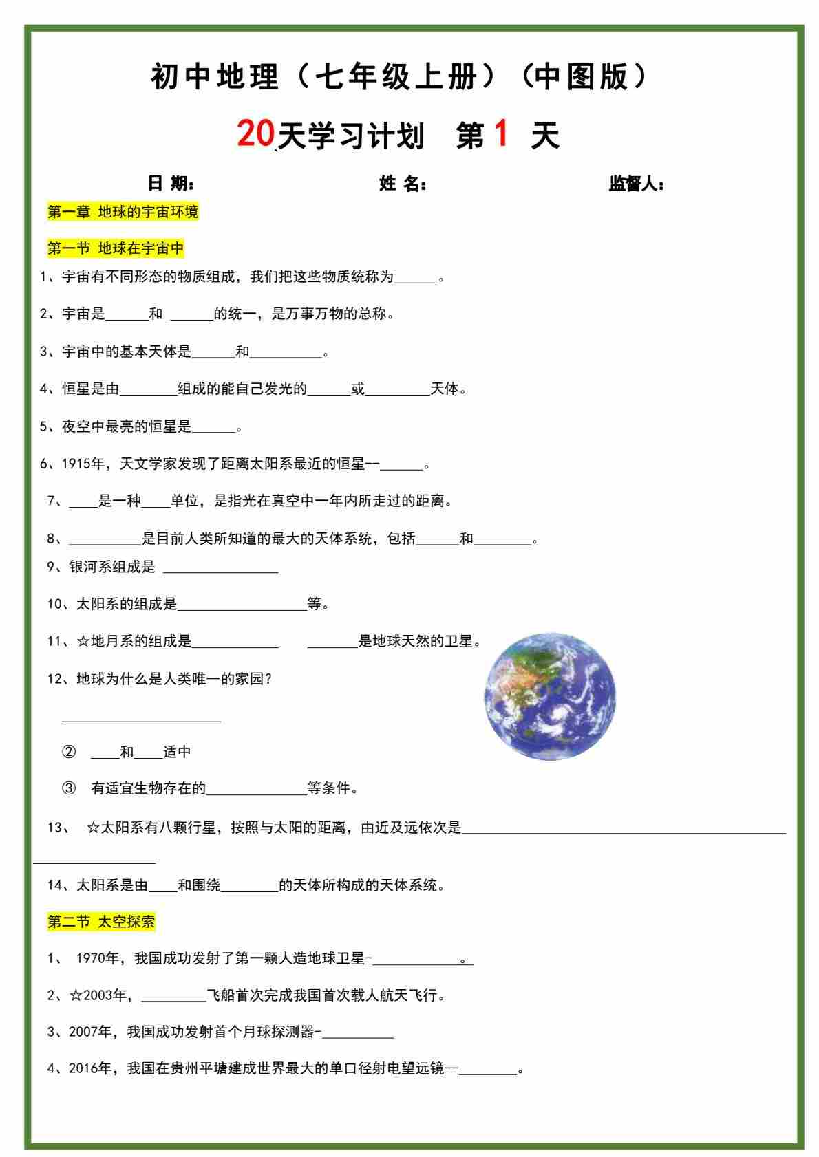 第一章 地球的宇宙环境 第二章 地球和地图【速记清单】-2024-2025学年七年级地理上册单元速记·巧练(中图版)(挖空版)