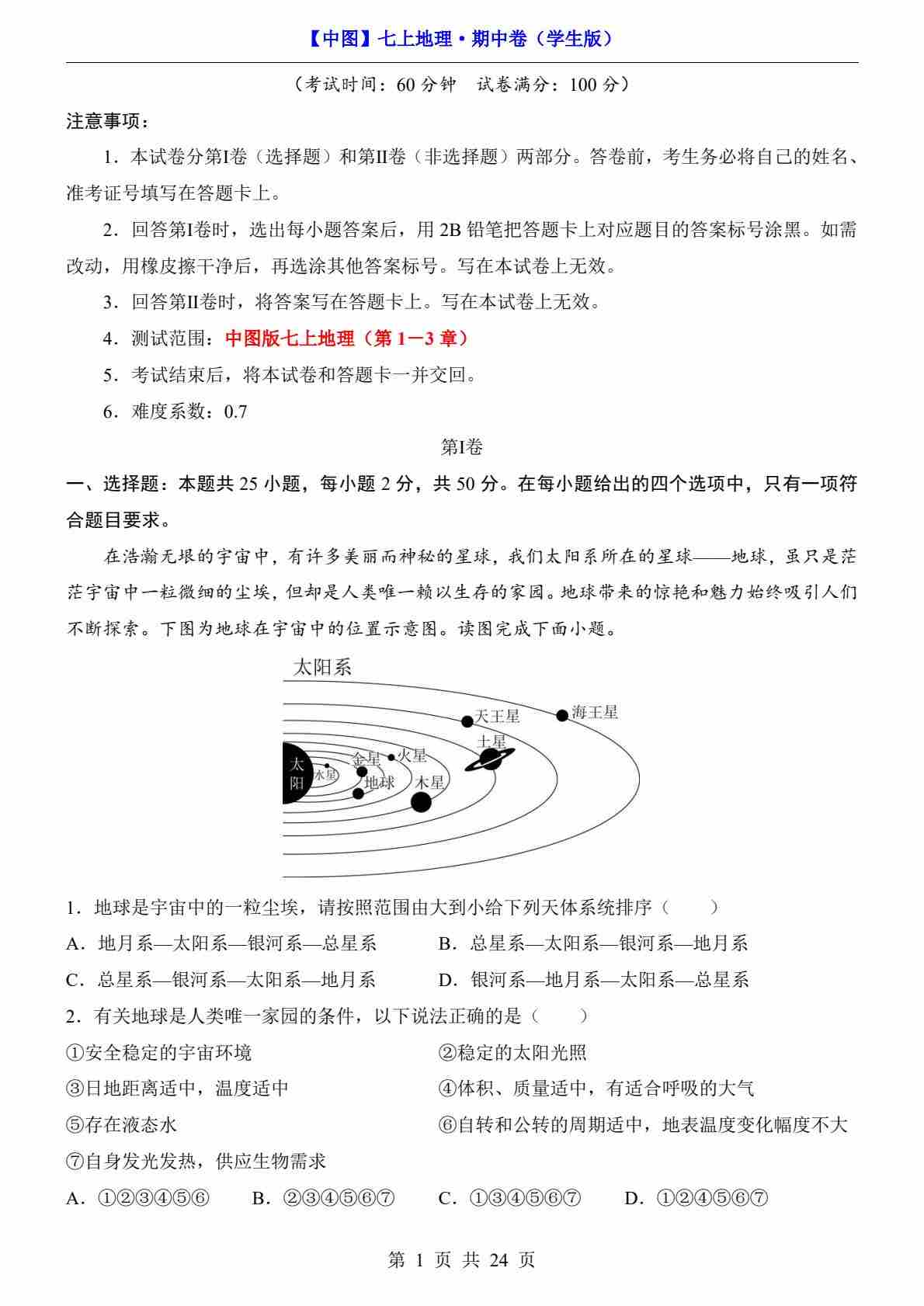 第一章 地球的宇宙环境 第二章 地球和地图【速记清单】-2024-2025学年七年级地理上册单元速记·巧练(中图版)(答案版)