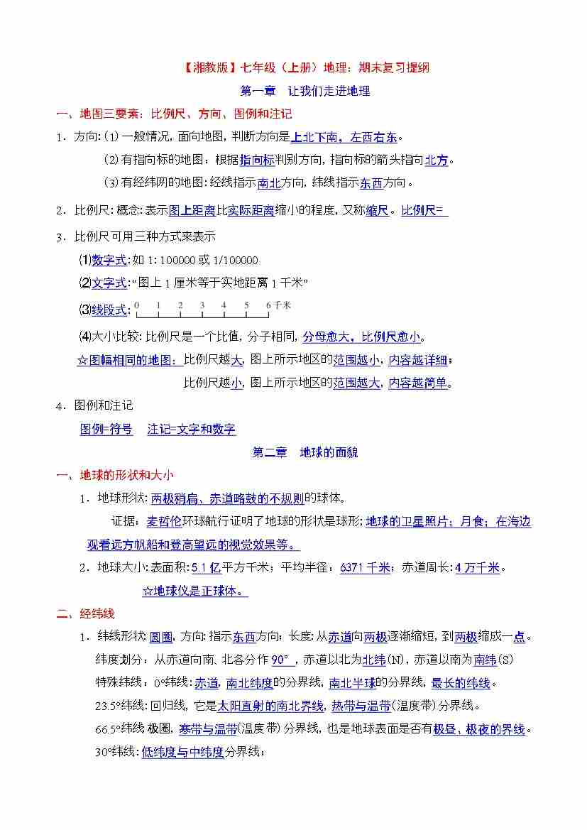 【湘教】七上地理期末复习提纲
