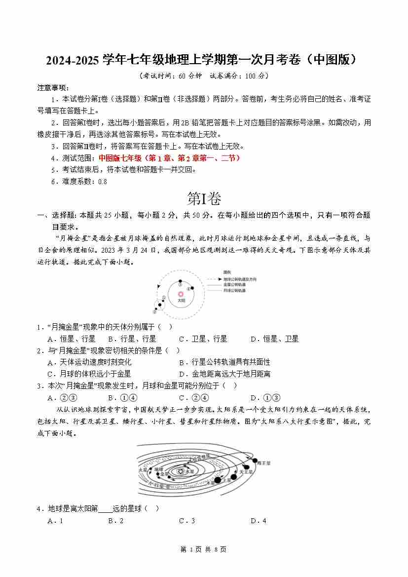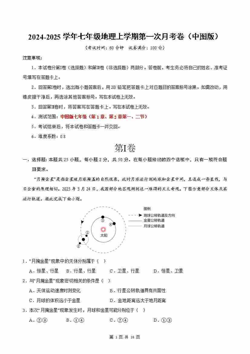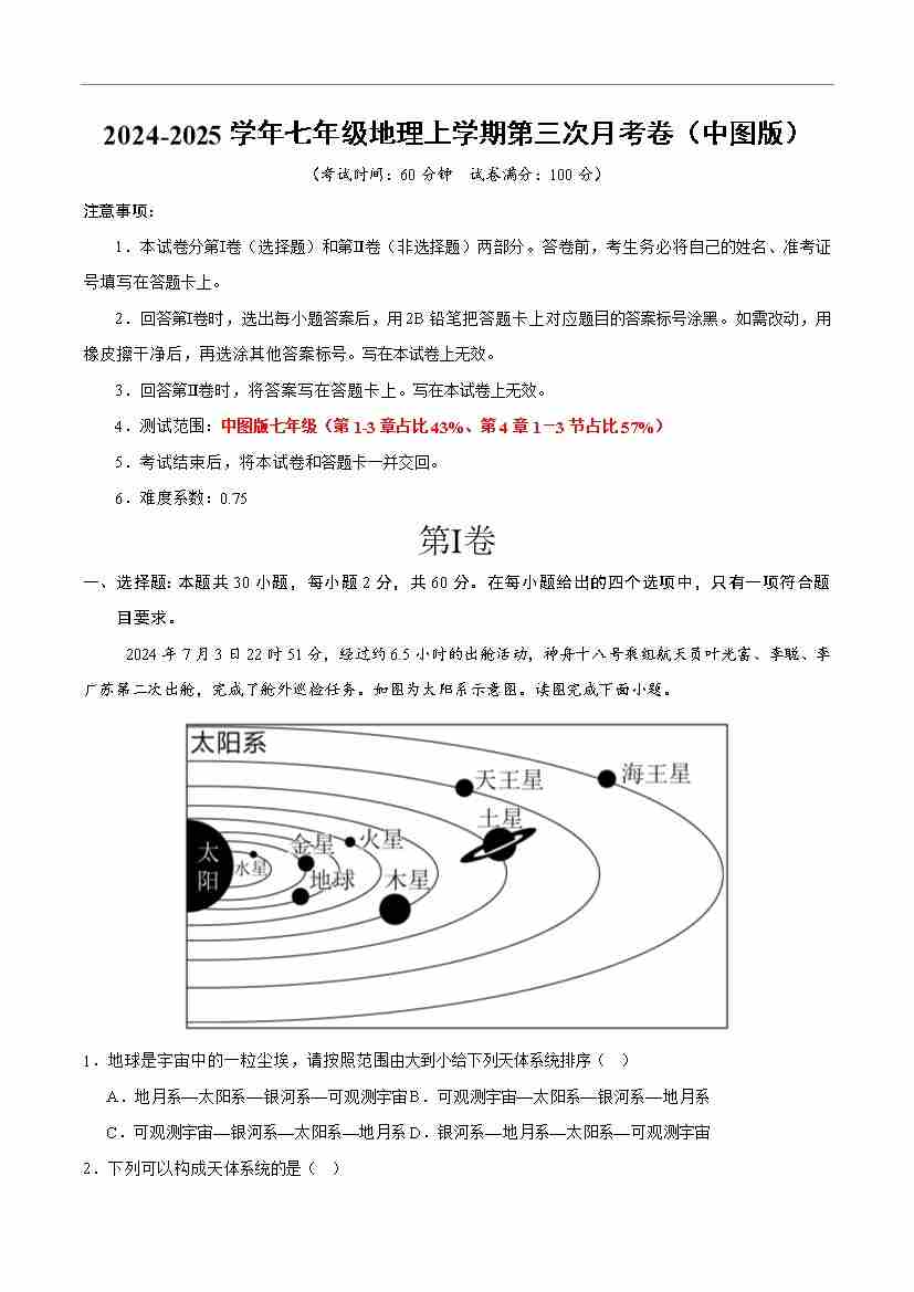 七年级地理第一次月考卷(A4考试版)【测试范围:第1章-第2章第2节】(中图版2024)
