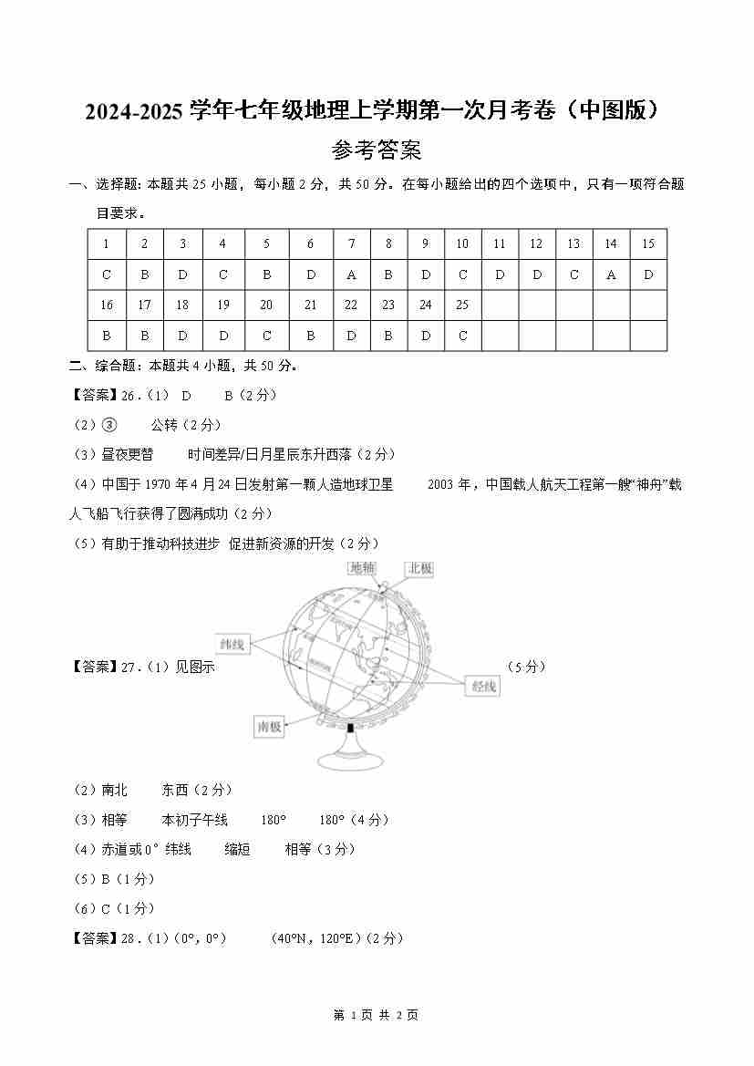 七年级地理第一次月考卷(参考答案)(中图版2024)