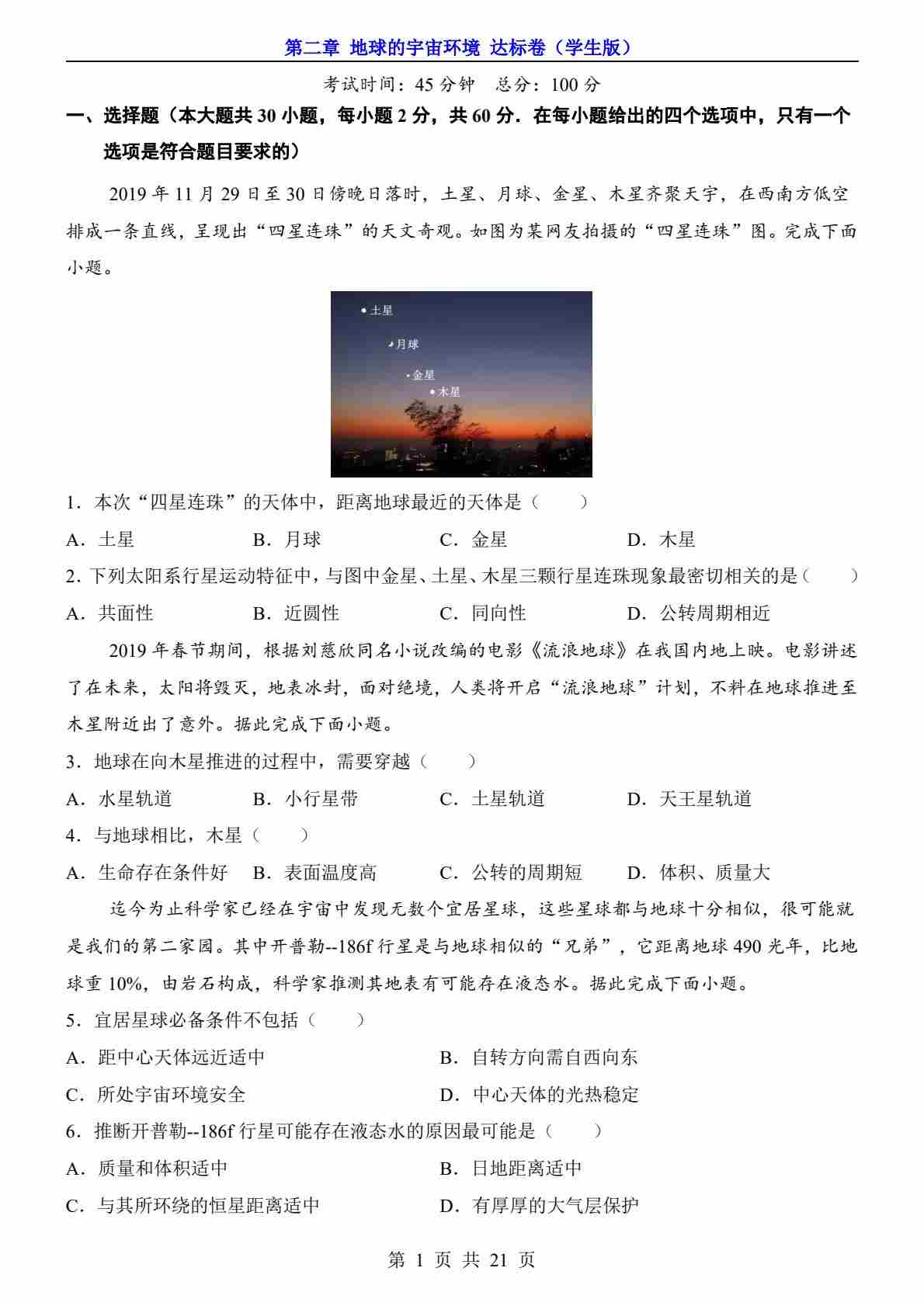 第2章 地球的宇宙环境(达标卷)