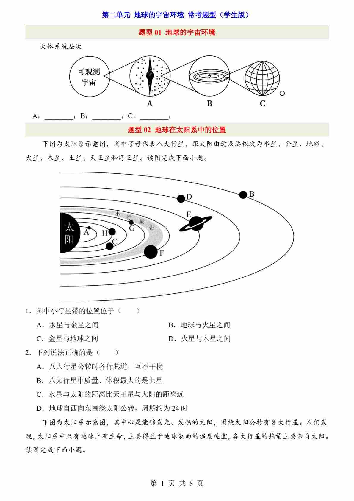 第2单元 地球的宇宙环境(常考题型)