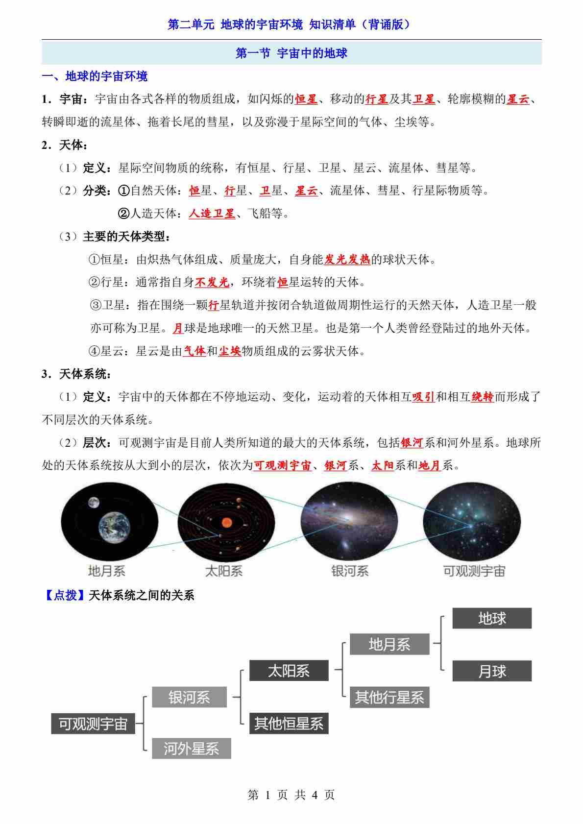 第2单元 地球的宇宙环境(知识清单-背诵版)