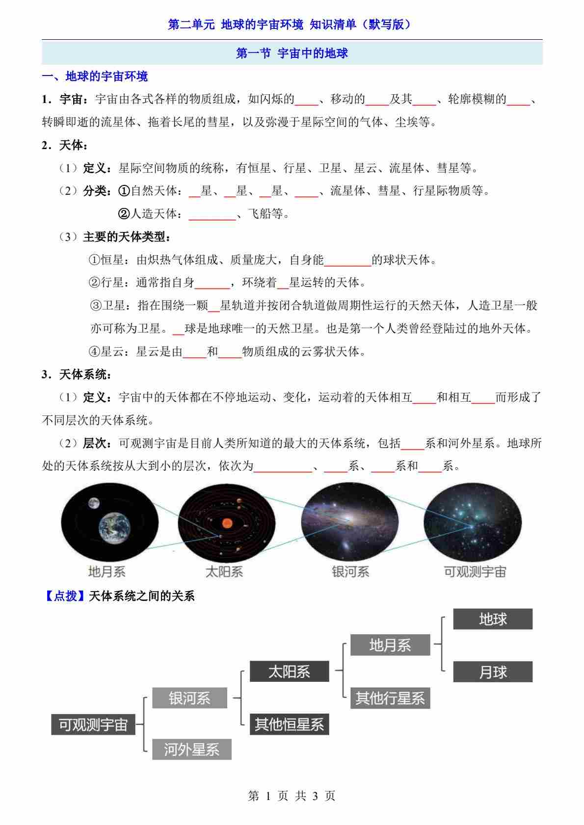第2单元 地球的宇宙环境(知识清单-默写版)