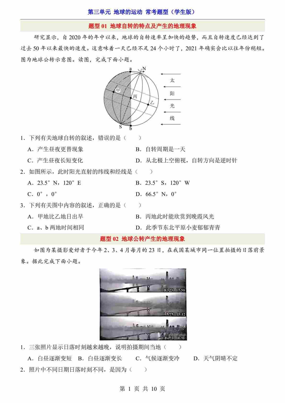 第3单元 地球的运动(常考题型)