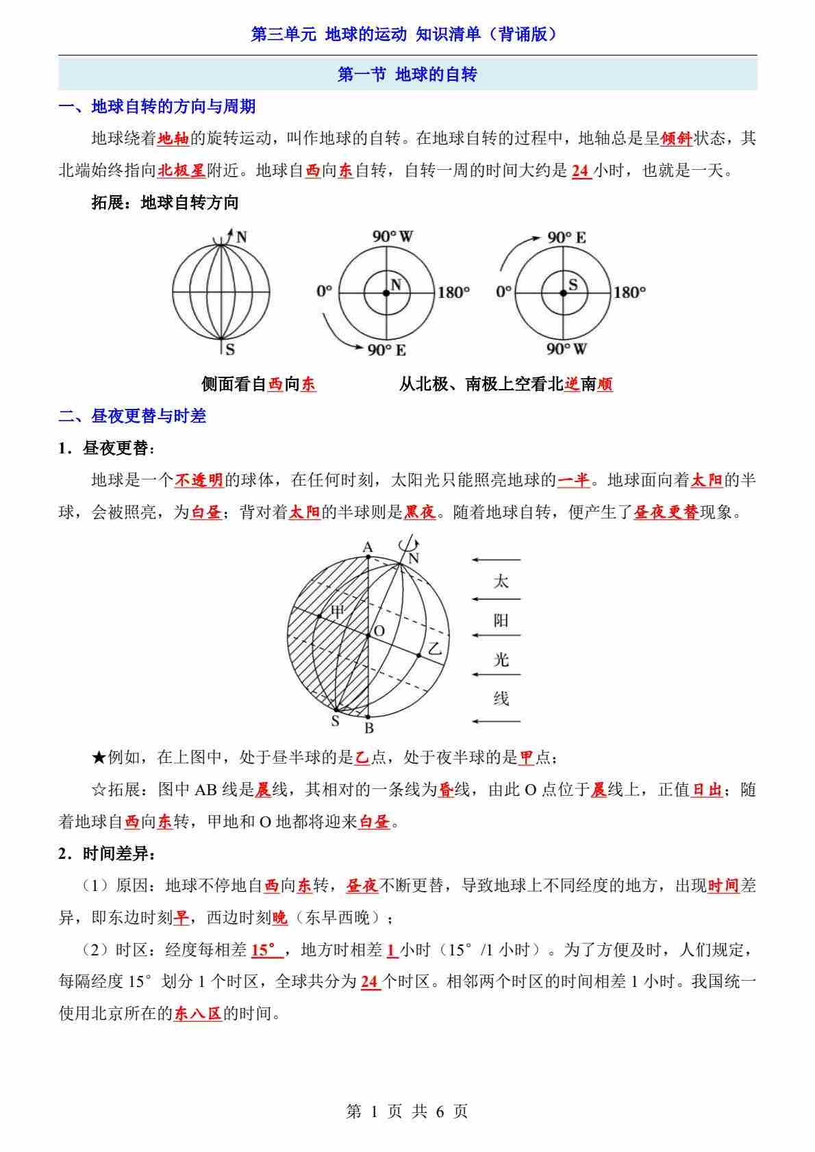 第3单元 地球的运动(知识清单-背诵版)