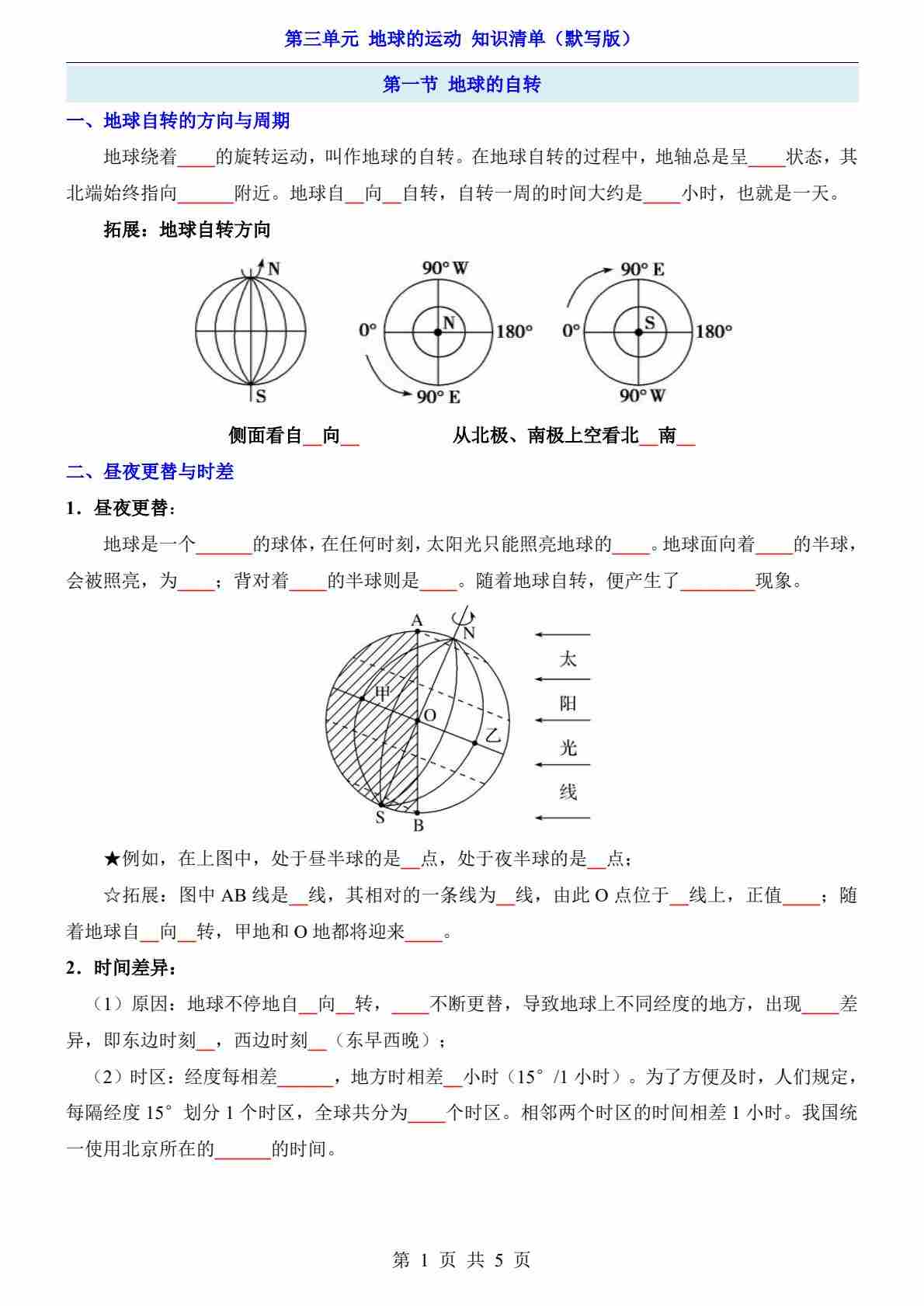 第3单元 地球的运动(知识清单-默写版)