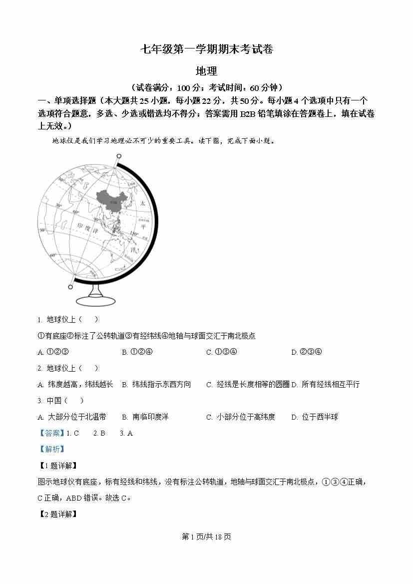 七年级上学期期末地理试题解析版