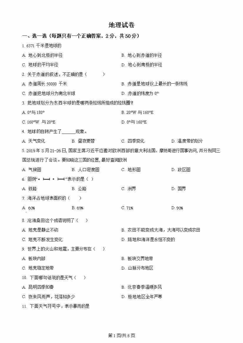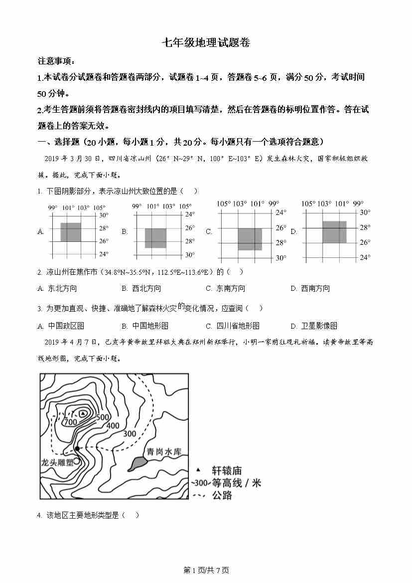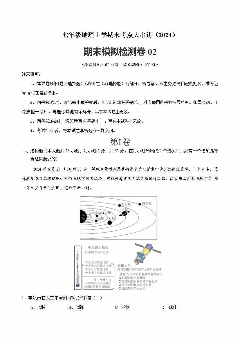 七年级上学期期末地理试题原卷版