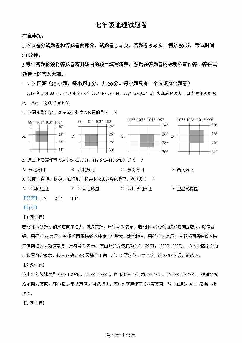 七年级上学期期末联考地理试题解析版