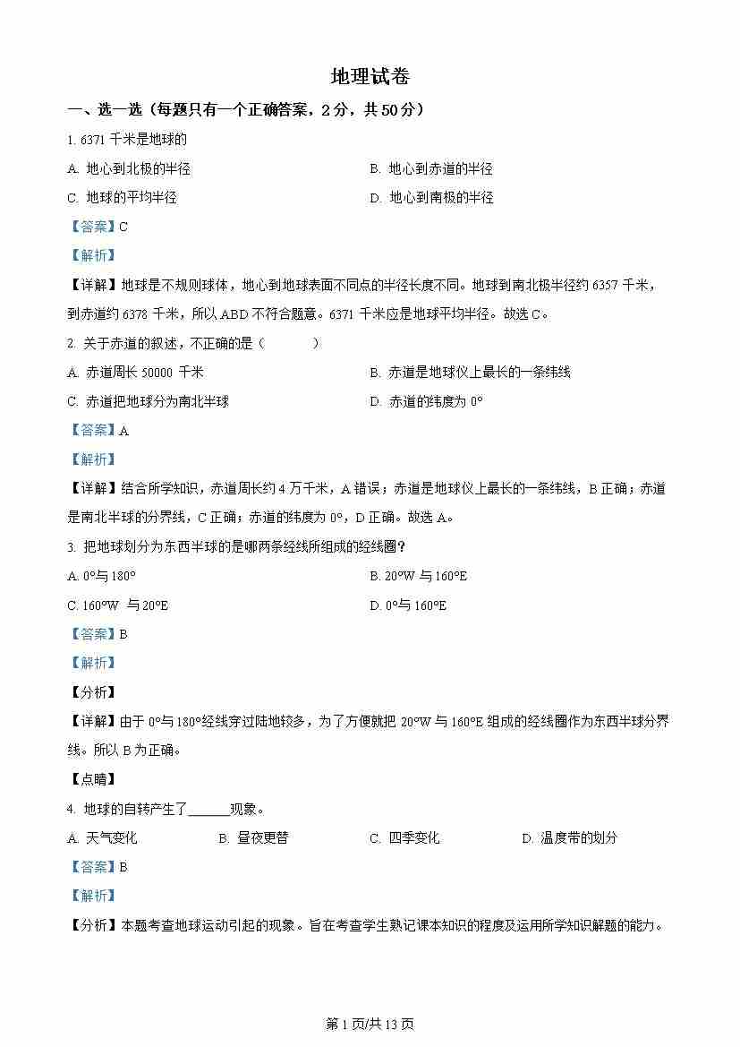 七年级上学期期末地理试卷解析版