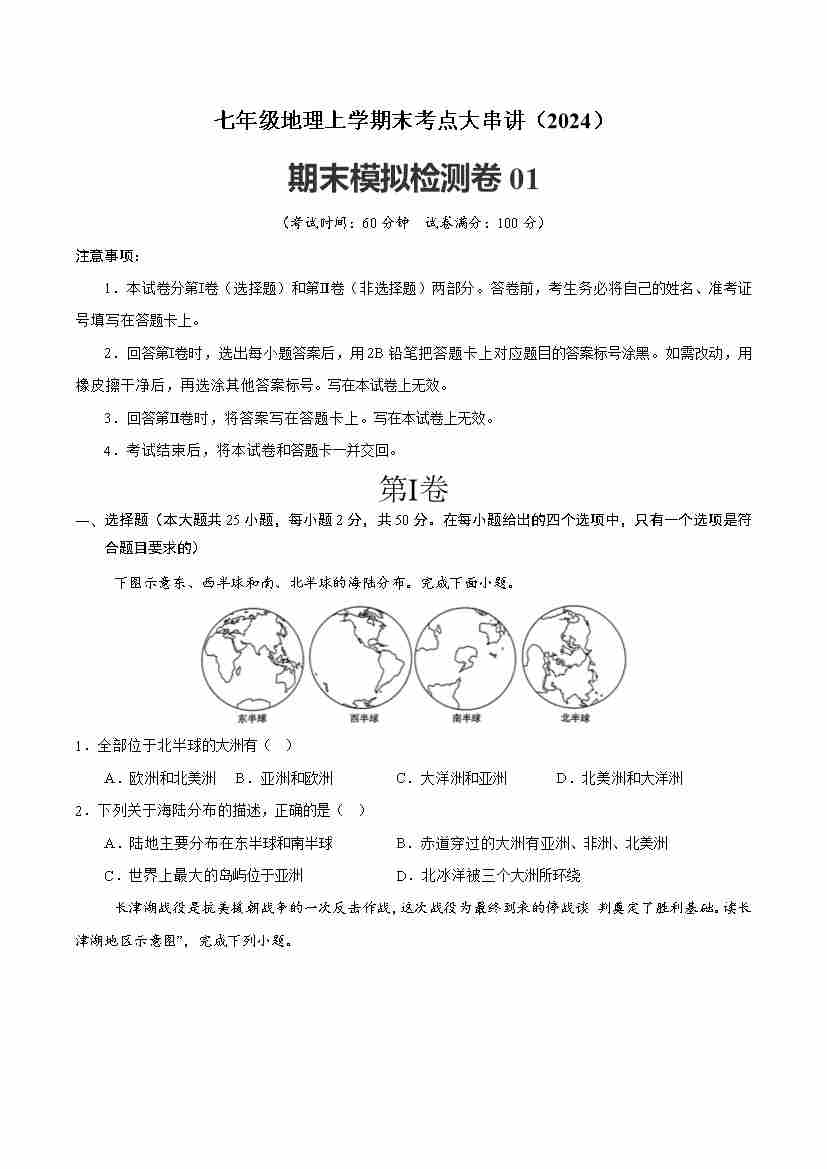 七年级上学期期末联考地理试题原卷版